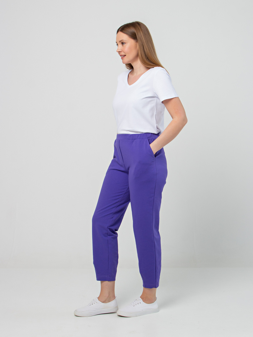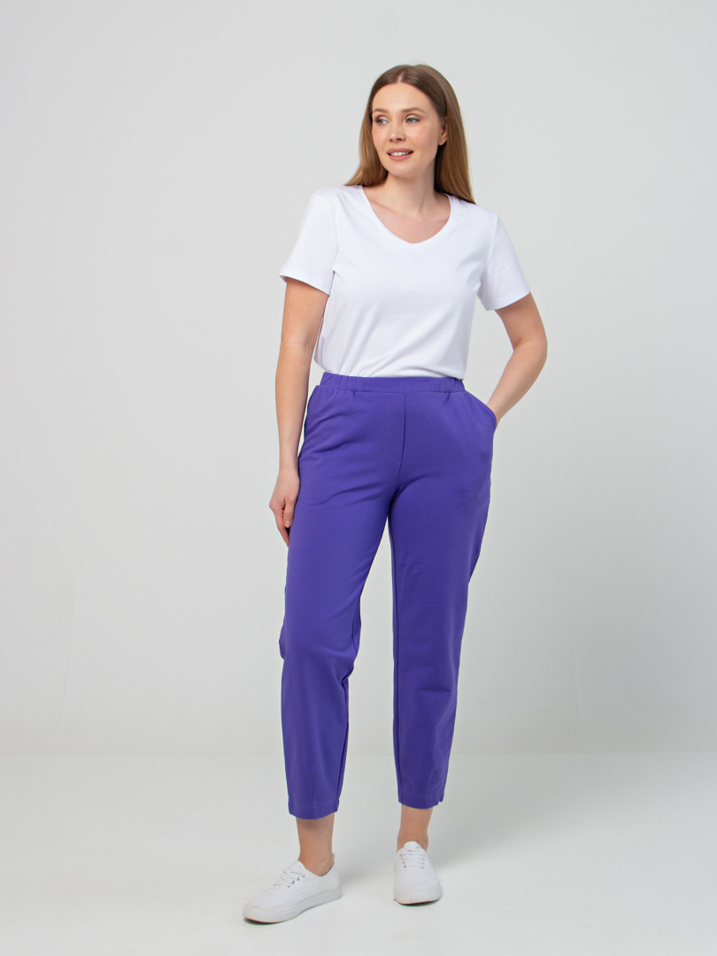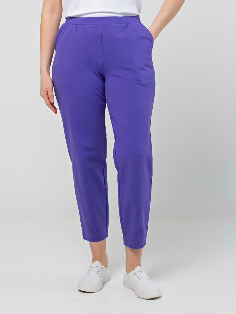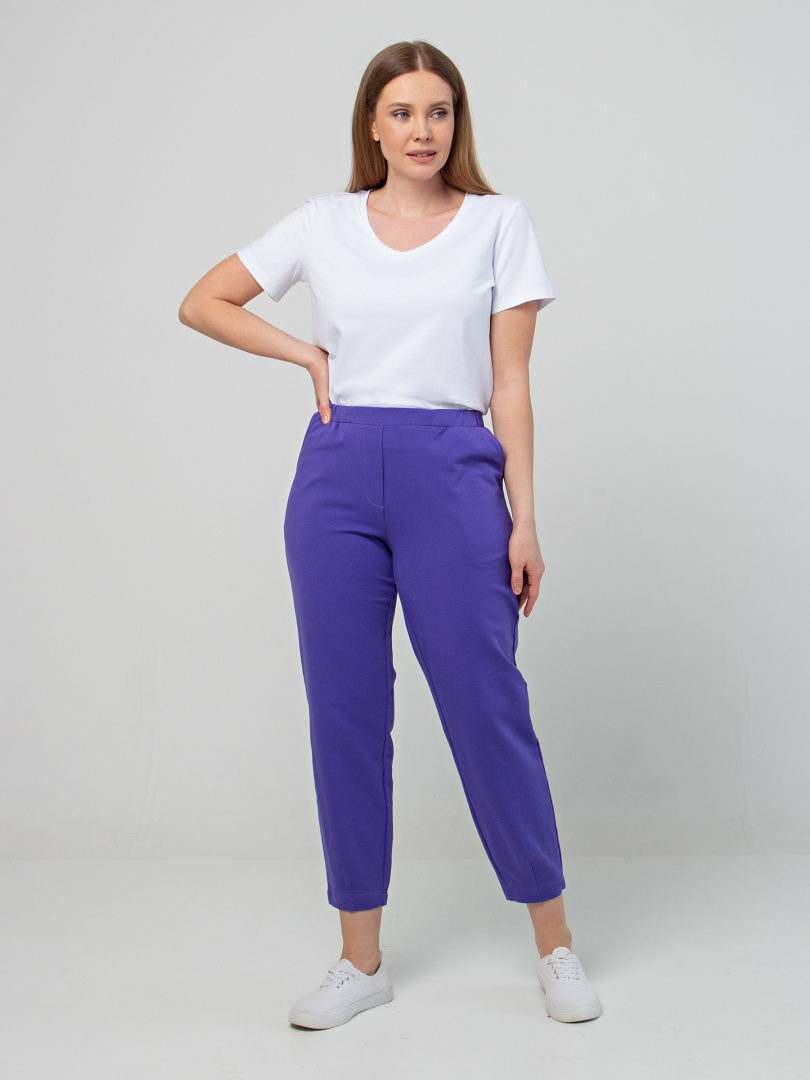 Длинные брюки из плотного трикотажа.  Модель средней посадки прямого покроя  зауженная книзу за счет декоративных вытачек по низу брюк. Притачной пояс с широкой резинкой.  На передних половинках боковые  карманы с наклонным входом. Модель имеет декоративный гульфик.