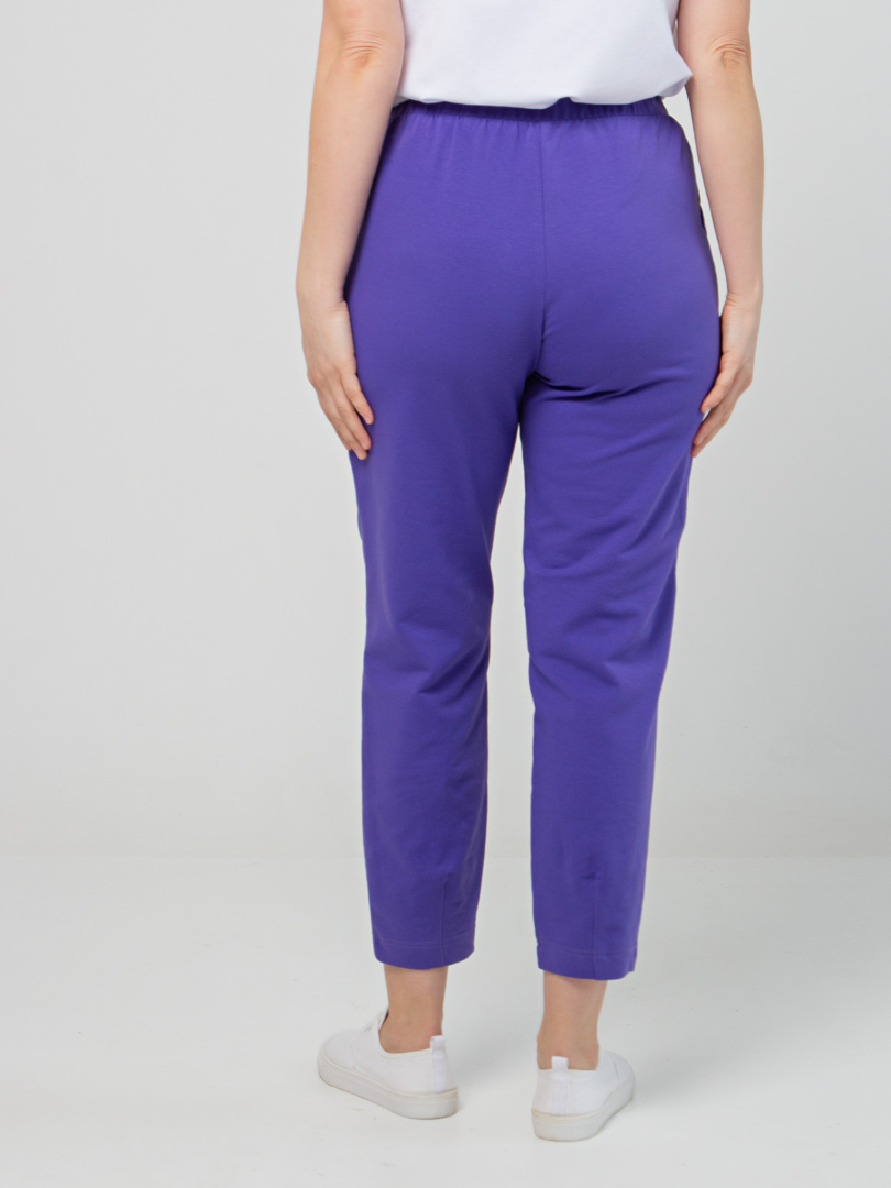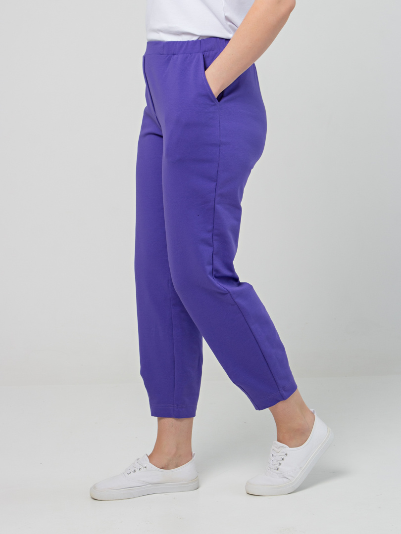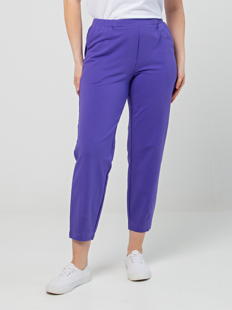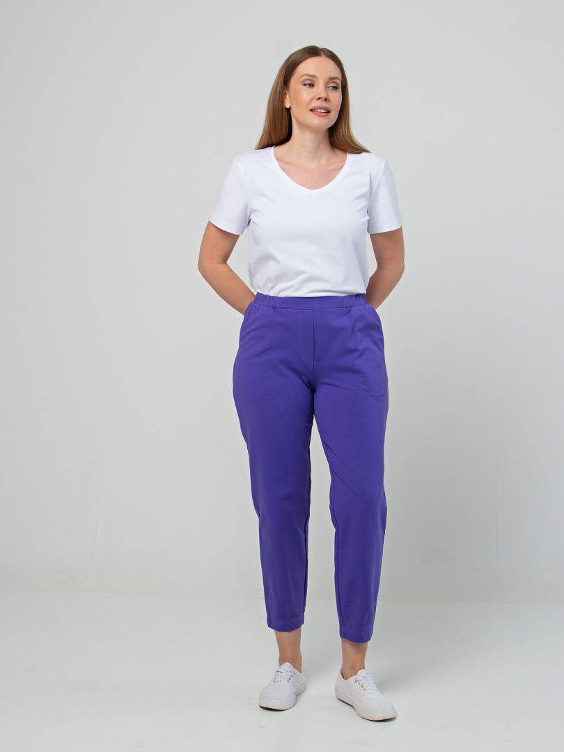 Длинные брюки из плотного трикотажа.  Модель средней посадки прямого покроя  зауженная книзу за счет декоративных вытачек по низу брюк. Притачной пояс с широкой резинкой.  На передних половинках боковые  карманы с наклонным входом. Модель имеет декоративный гульфик.