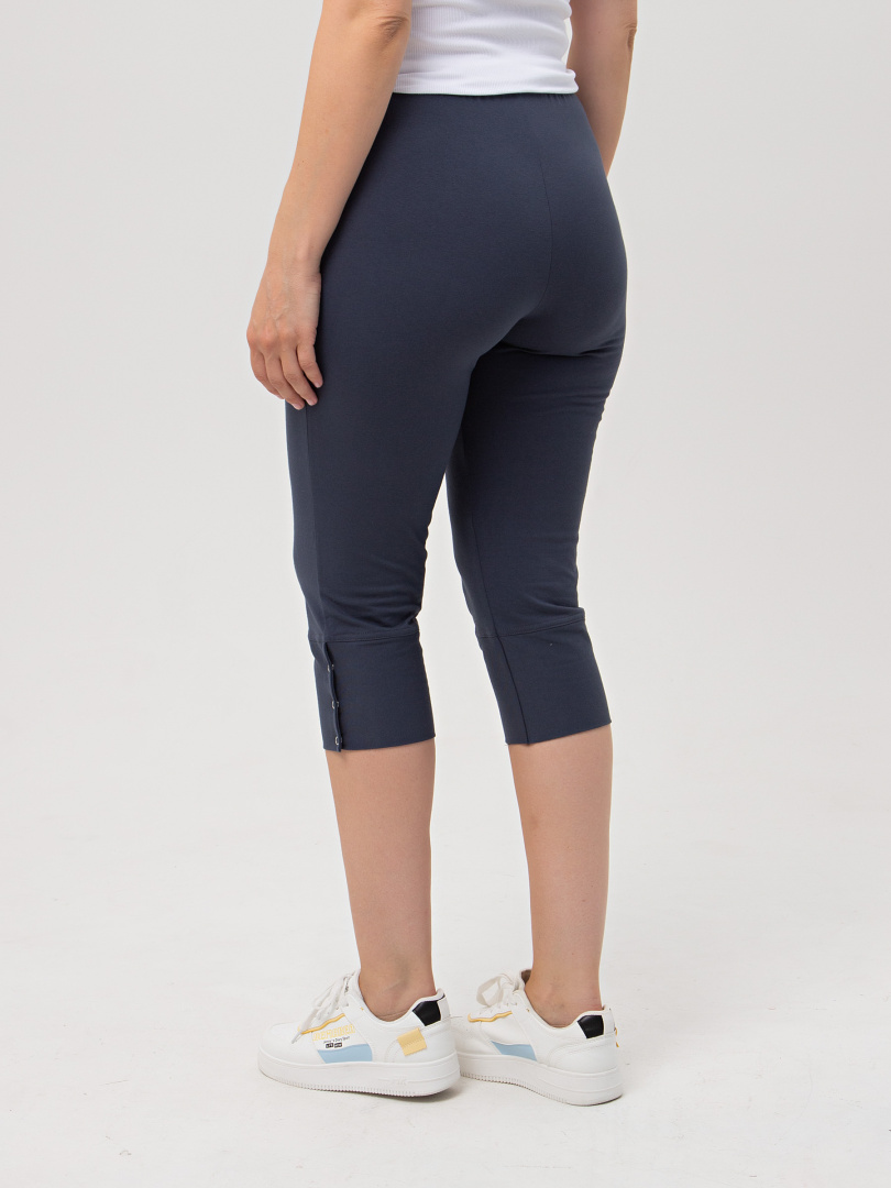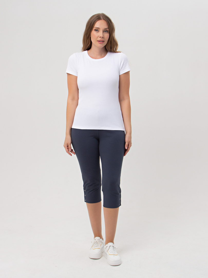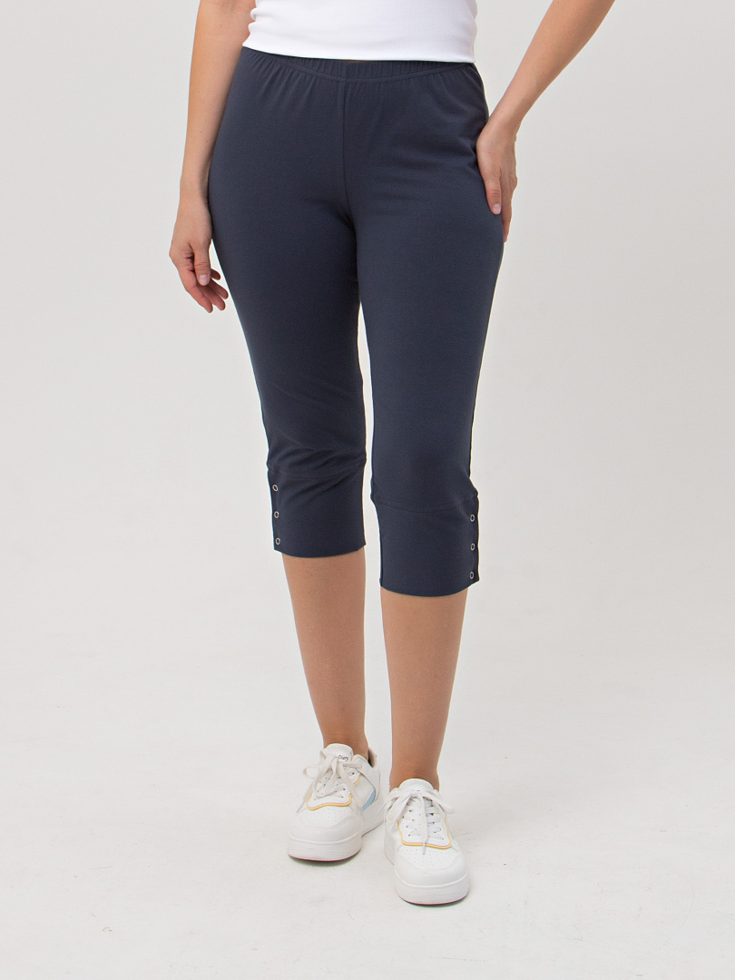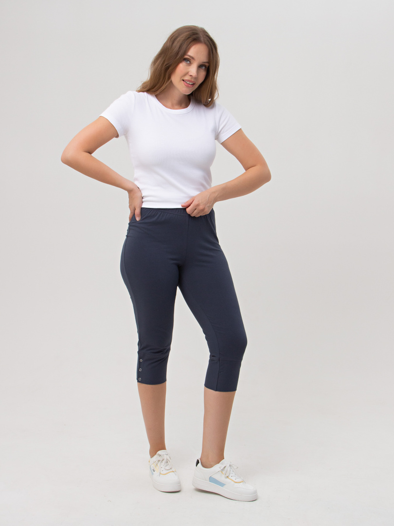 Трикотажные малообъёмные бриджи длиной до середины икры. Модель прямого покроя слегка заужена книзу. По низу – широкие притачные манжеты с застёжкой на 3 кнопки. Пояс - на резинке.
