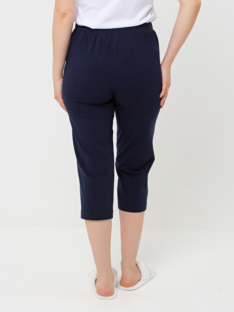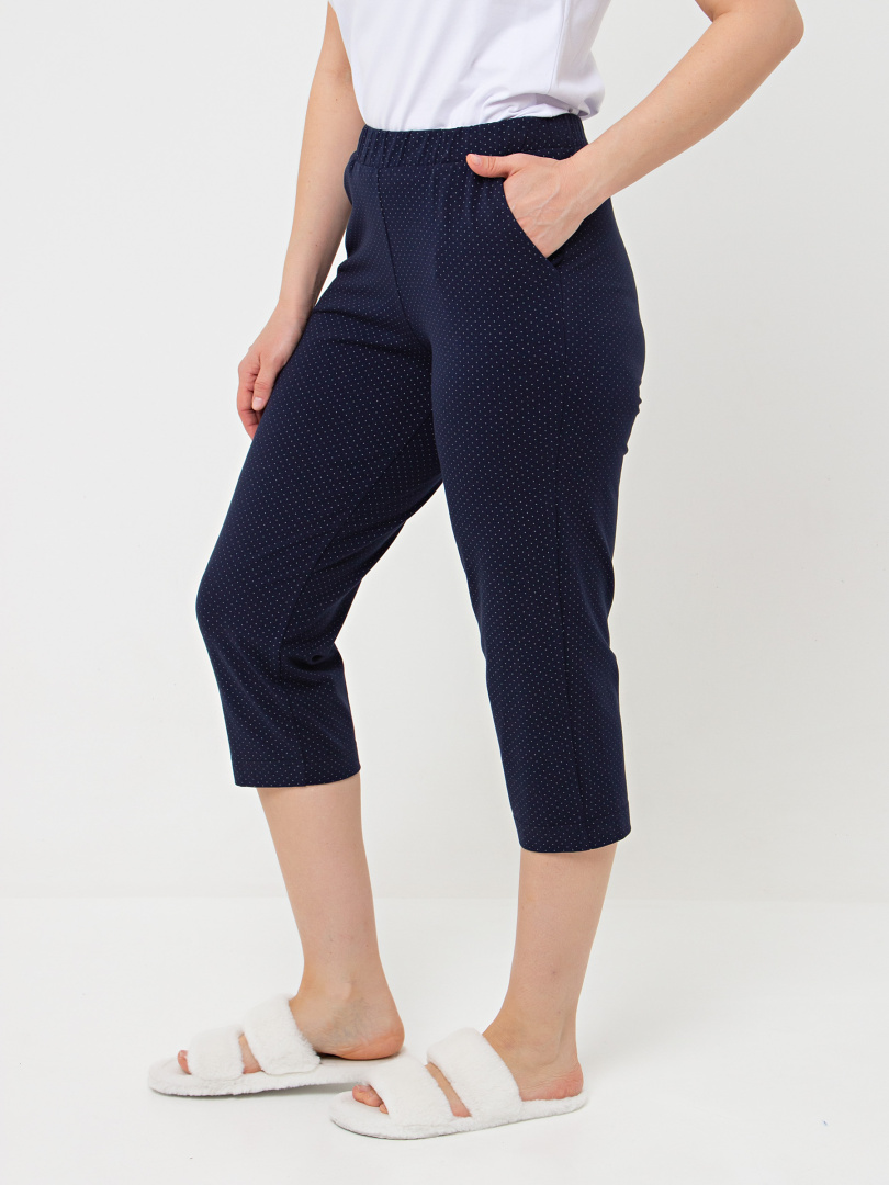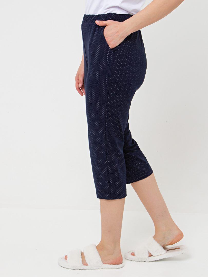 Мягкие трикотажные бриджи длиной до середины икры. Модель прямого покроя слегка заужена книзу. Притачной пояс с широкой резинкой. На передней половинке боковые карманы.