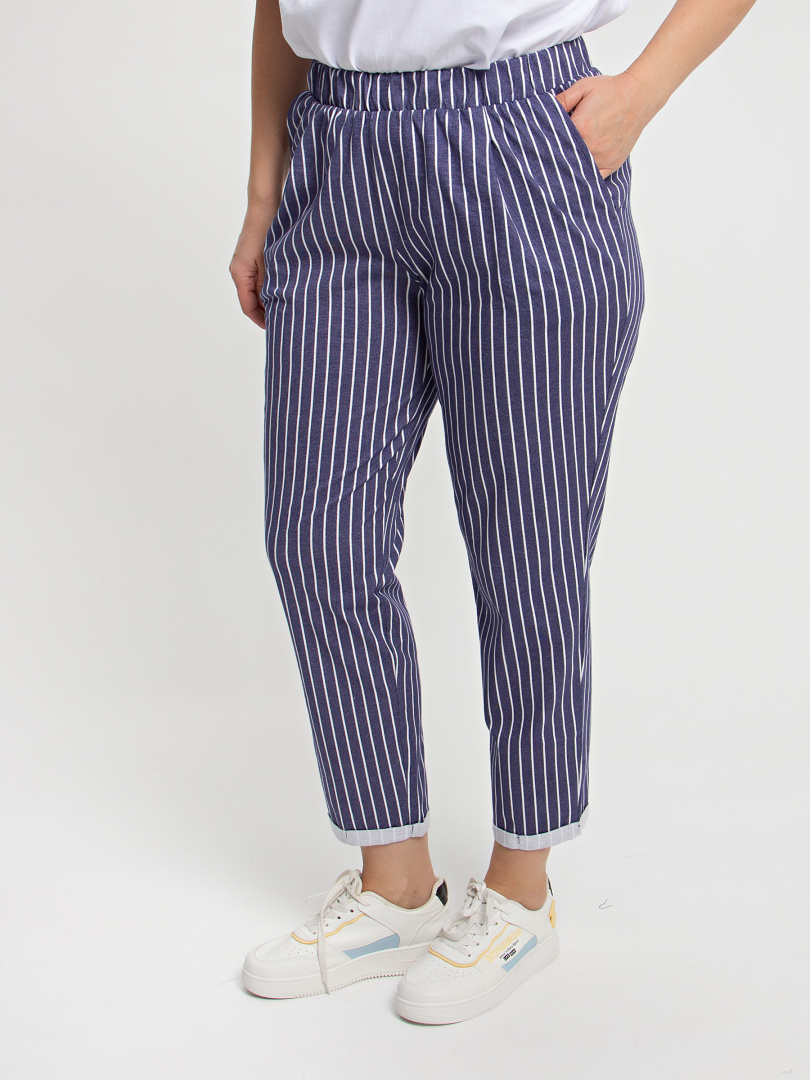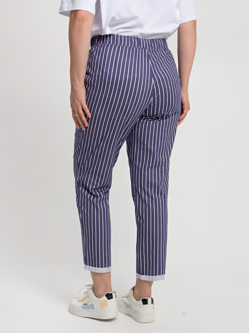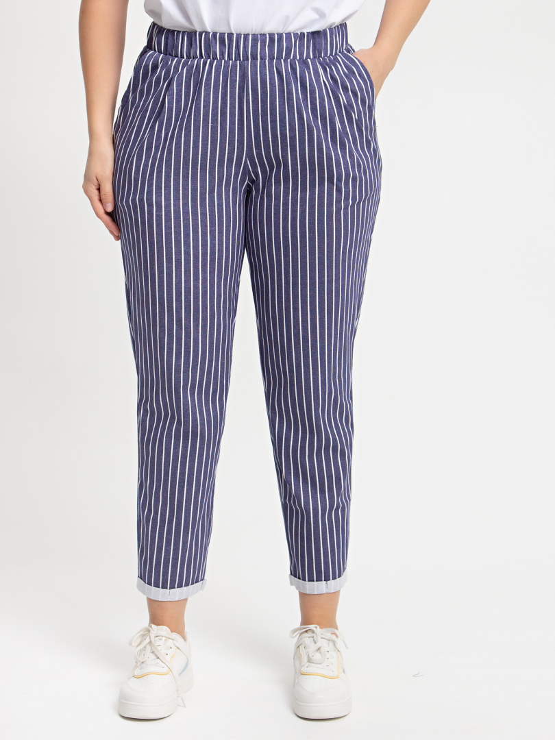 Брюки слегка укороченные. Модель свободного покроя, зауженная книзу. По линии талии мягкие защипы. Притачной пояс с широкой резинкой. Для удобства предусмотрены карманы. По низу брюк – отвороты.
