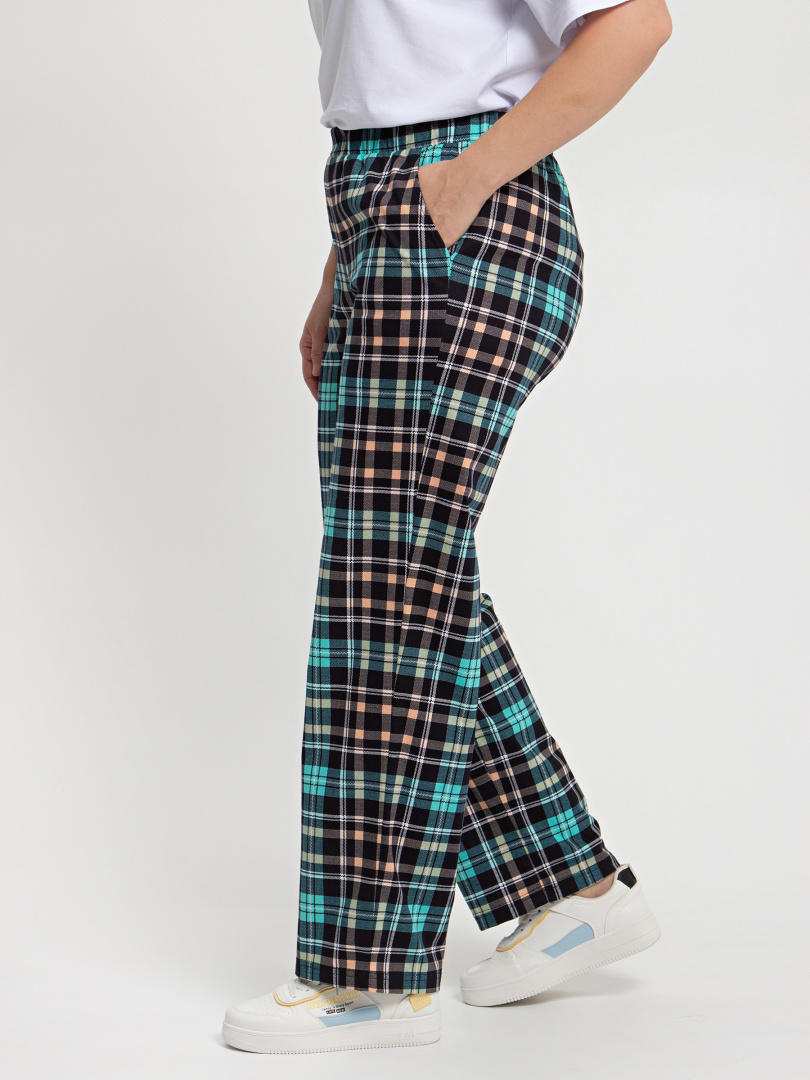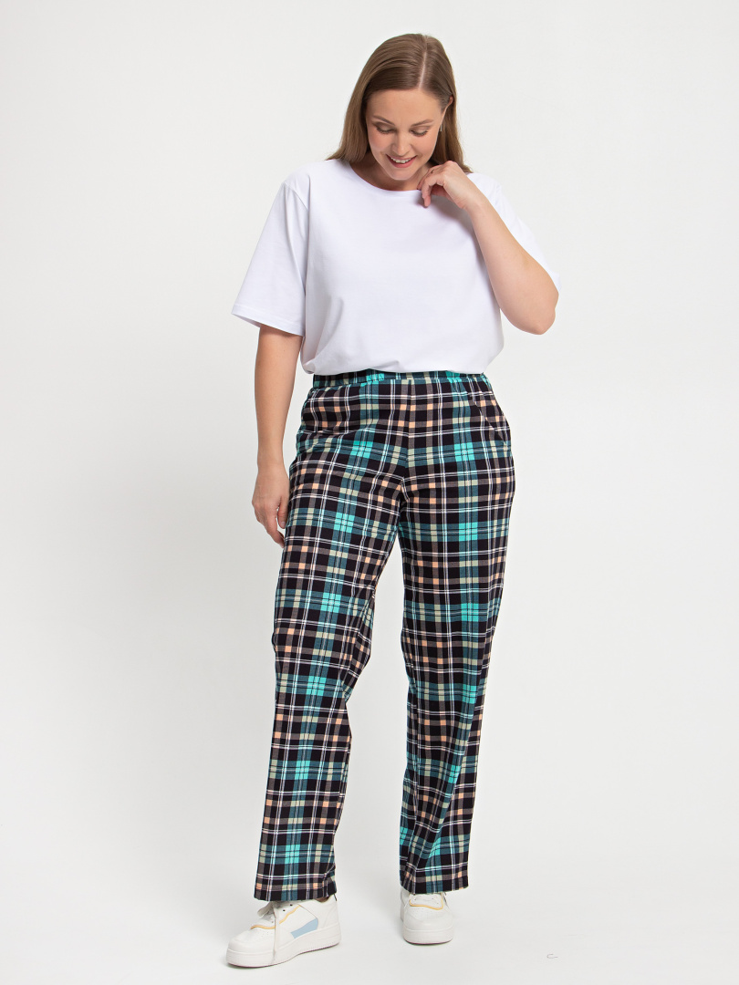 Длинные брюки прямого покроя. Притачной пояс с широкой резинкой. На передних половинках боковые карманы с наклонным входом.