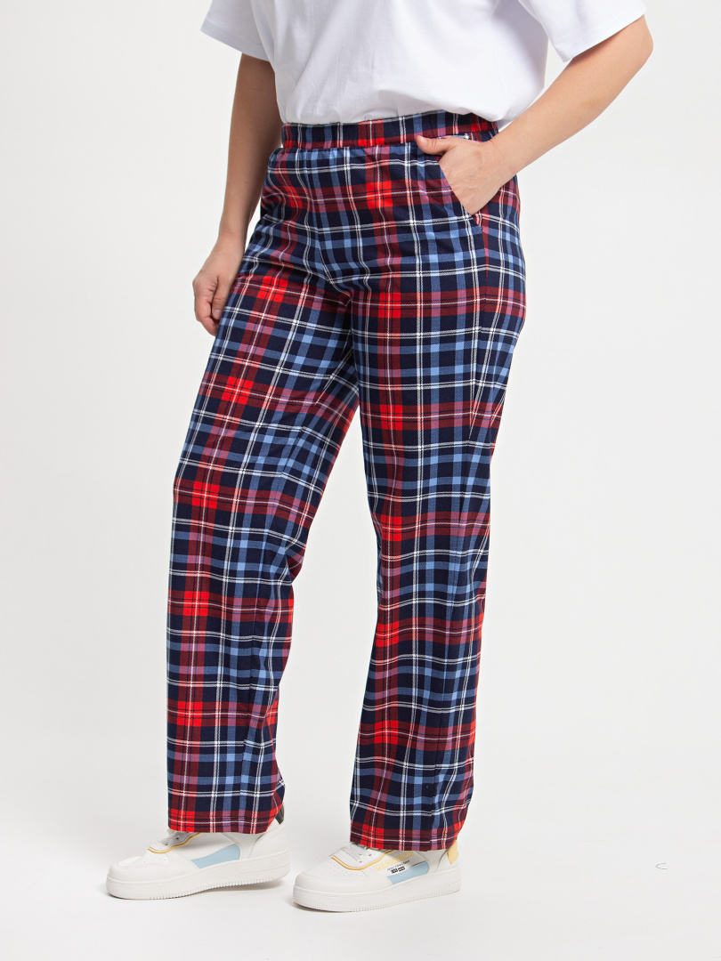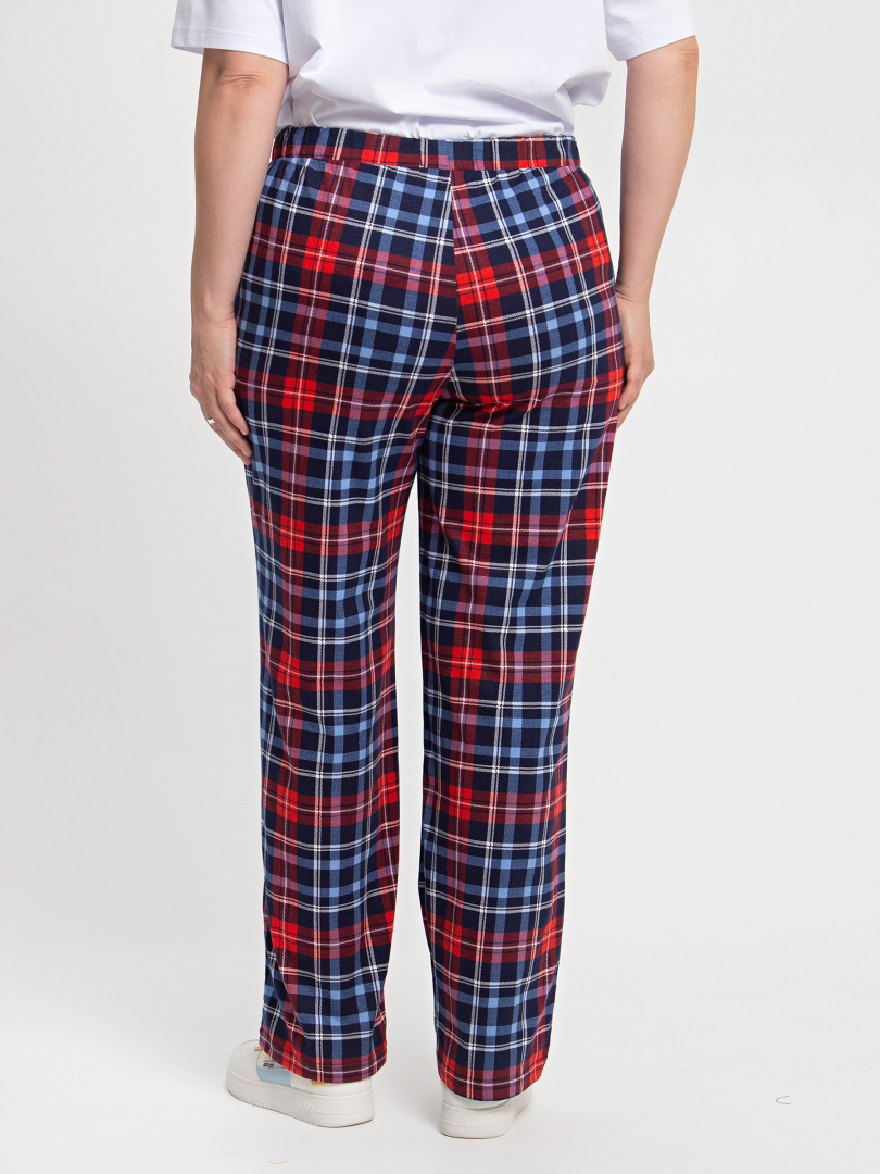 Длинные брюки прямого покроя. Притачной пояс с широкой резинкой. На передних половинках боковые карманы с наклонным входом.