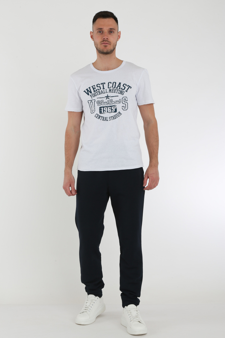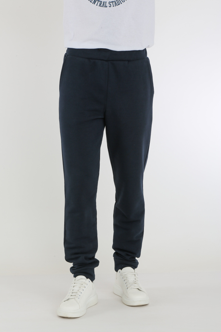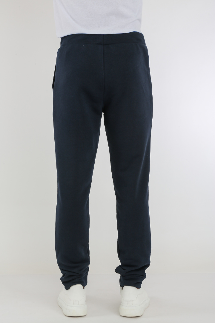 Длинные брюки из плотного трикотажа на манжете. Модель прямого покроя слегка заужена книзу. Притачной пояс с широкой резинкой и шнуром. На передних половинках боковые карманы с наклонным входом.