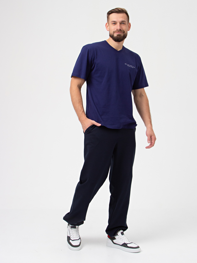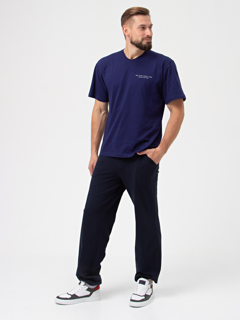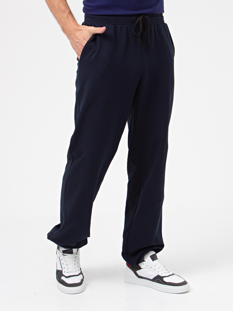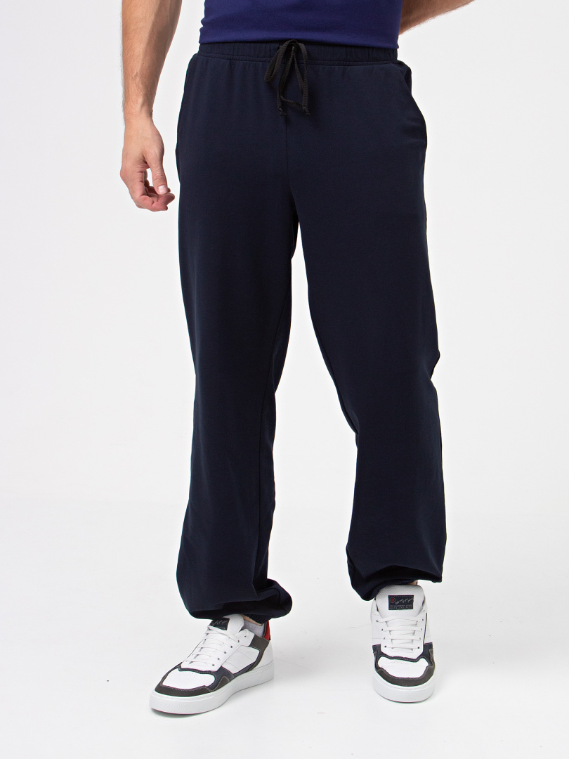 Длинные брюки из плотного трикотажа. Модель прямого покроя. По низу брюк очень удобная резина. На передних половинках боковые карманы с наклонным входом. Притачной пояс с широкой резинкой и шнуром.