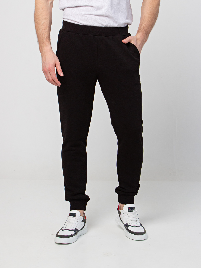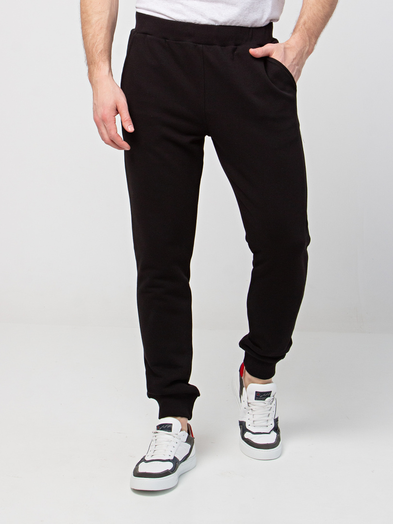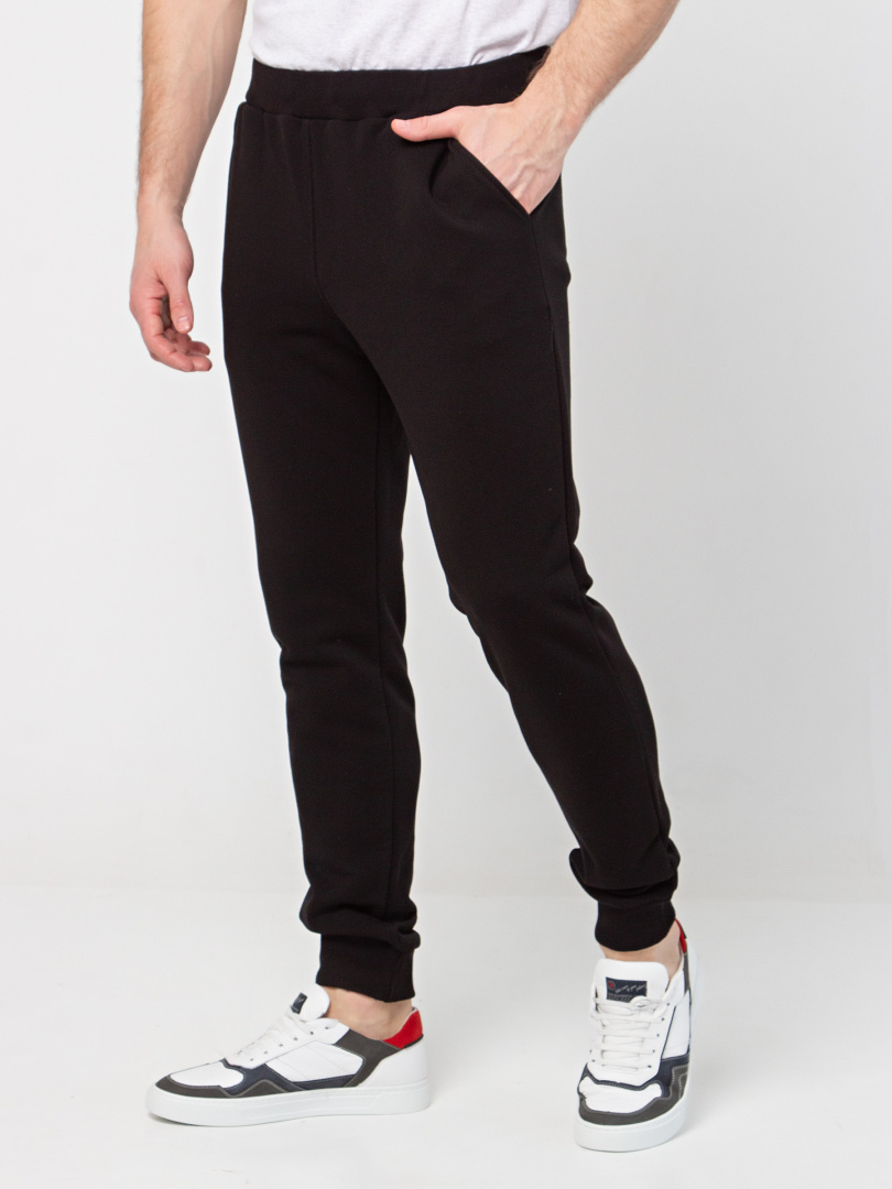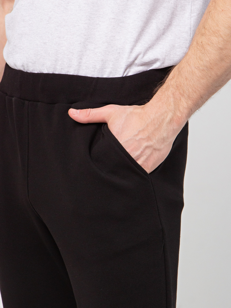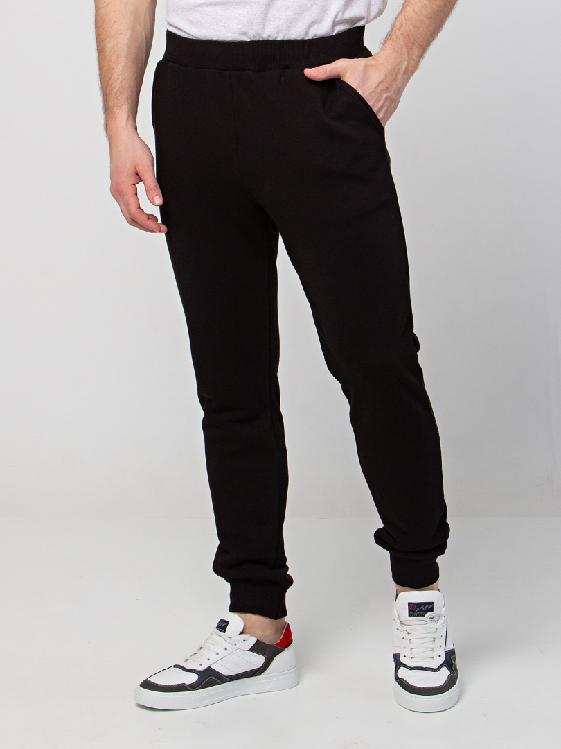 Длинные брюки из плотного трикотажа на манжете. Модель прямого покроя слегка заужена книзу. Притачной пояс с широкой резинкой и шнуром. На передних половинках боковые карманы с наклонным входом.