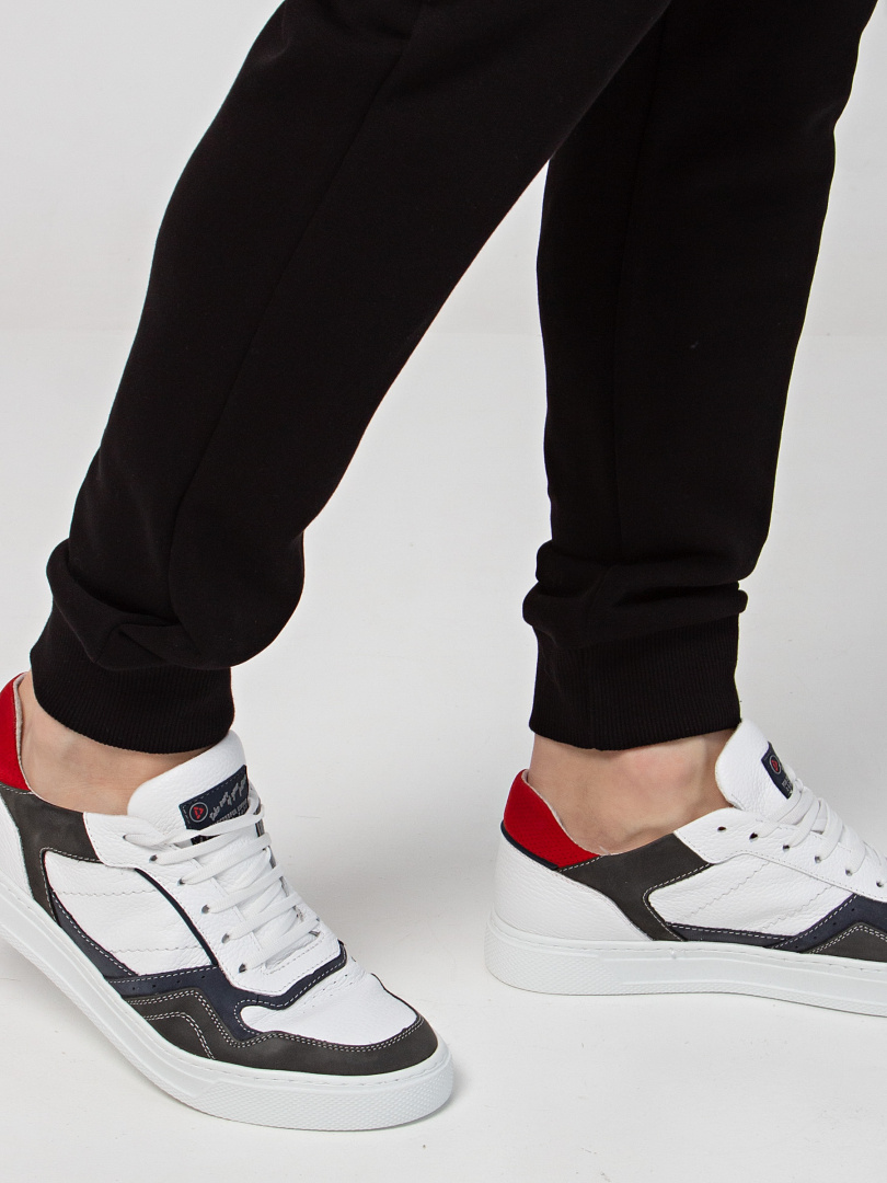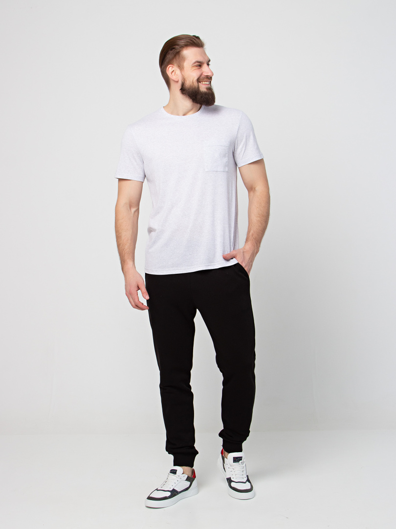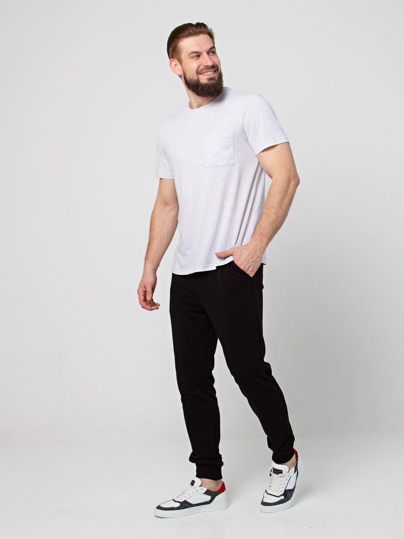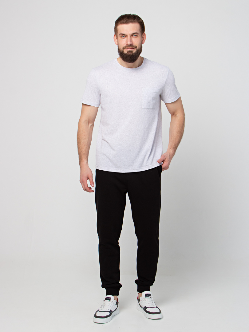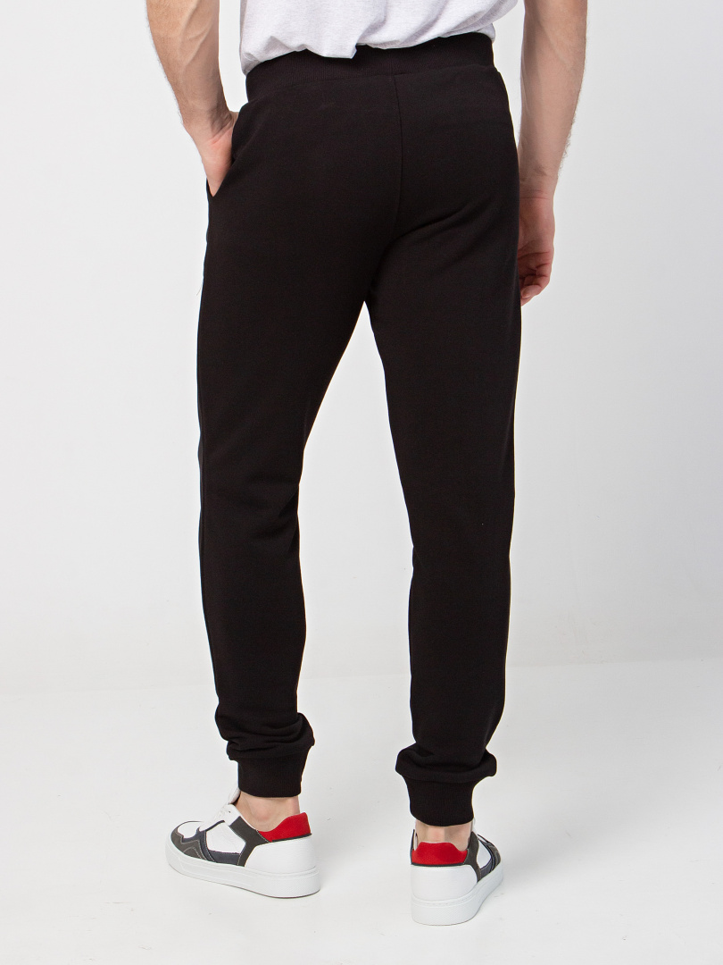 Длинные брюки из плотного трикотажа на манжете. Модель прямого покроя слегка заужена книзу. Притачной пояс с широкой резинкой и шнуром. На передних половинках боковые карманы с наклонным входом.