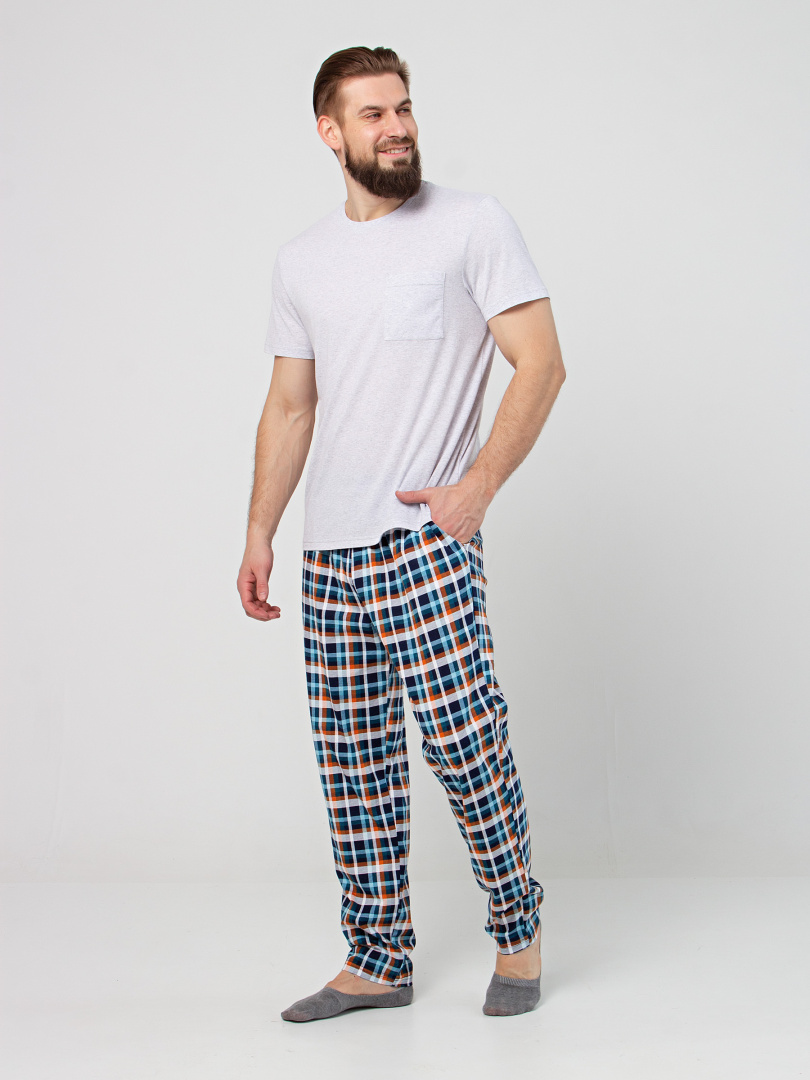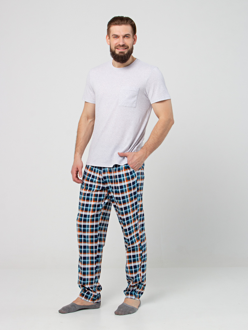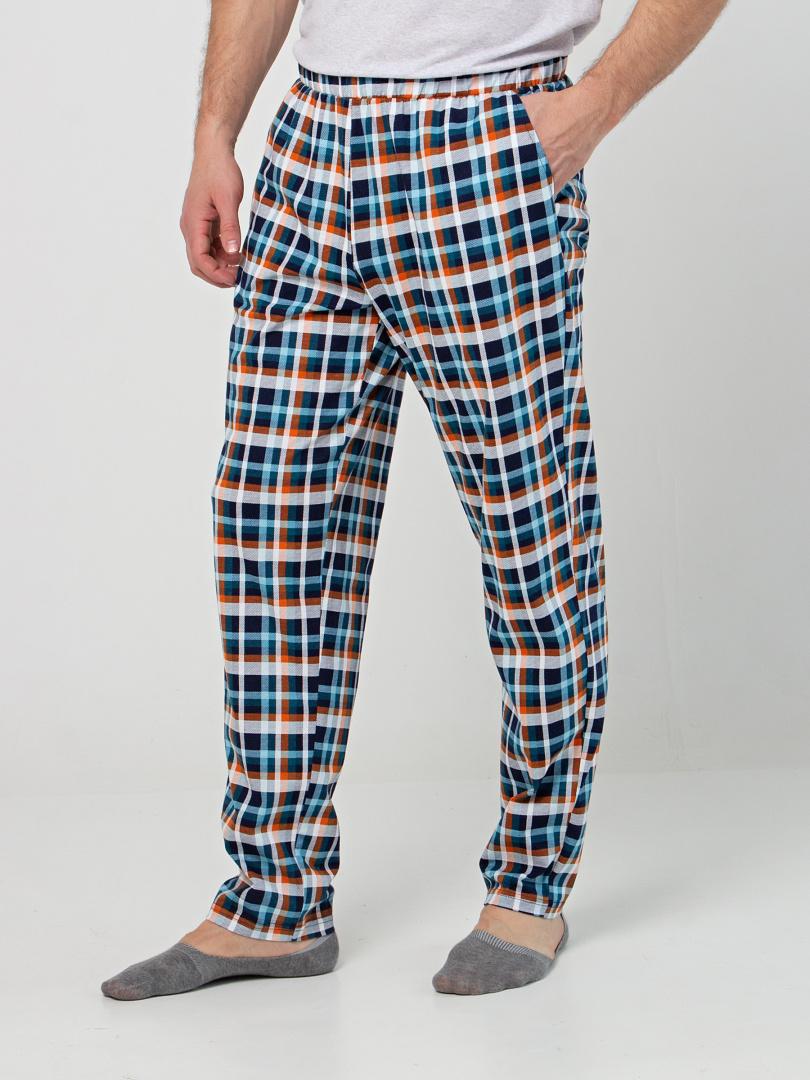 Длинные брюки из хлопкового трикотажа. Модель прямого покроя, слегка зауженная книзу. Притачной пояс с широкой резинкой. На передних половинках боковые карманы с наклонным входом.