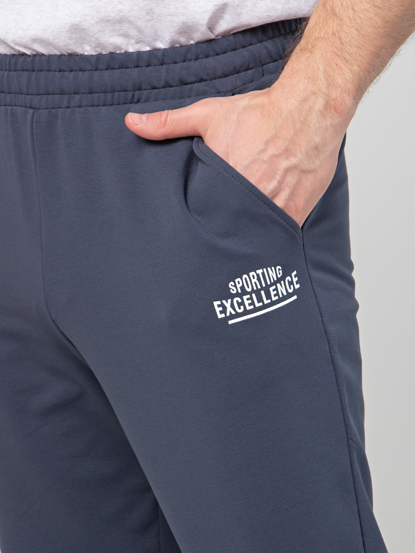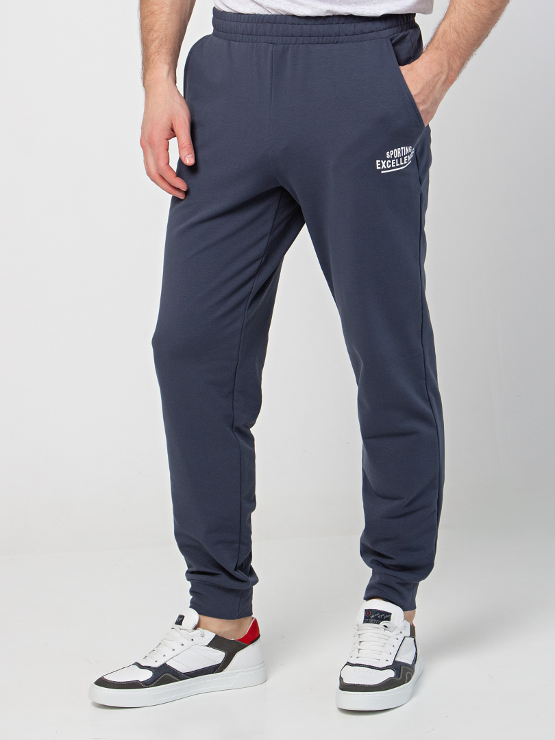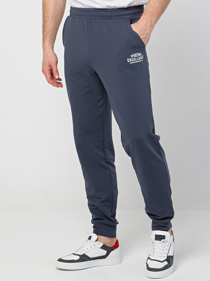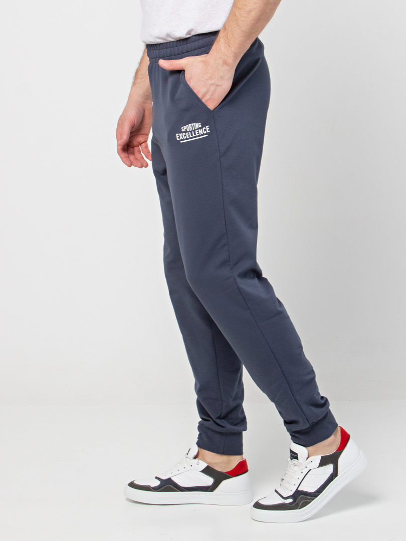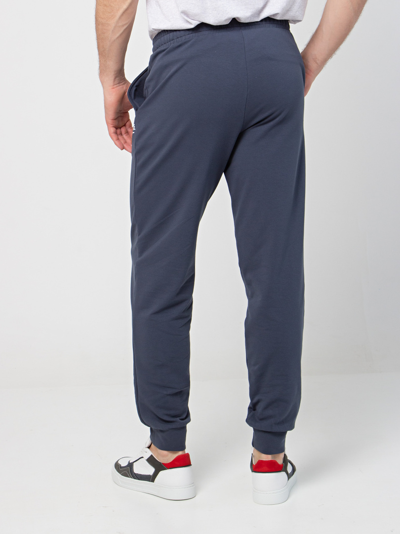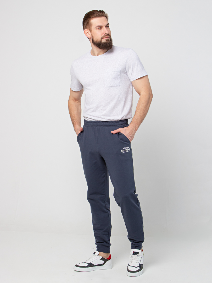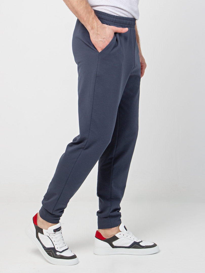Длинные брюки из плотного трикотажа на манжете. Модель прямого покроя слегка заужена книзу. Притачной пояс с широкой резинкой и шнуром. На передних половинках боковые карманы с наклонным входом.