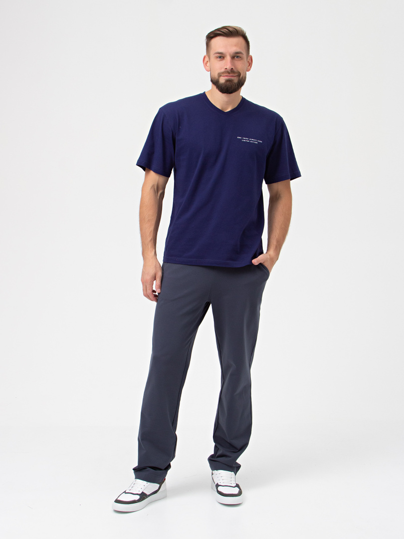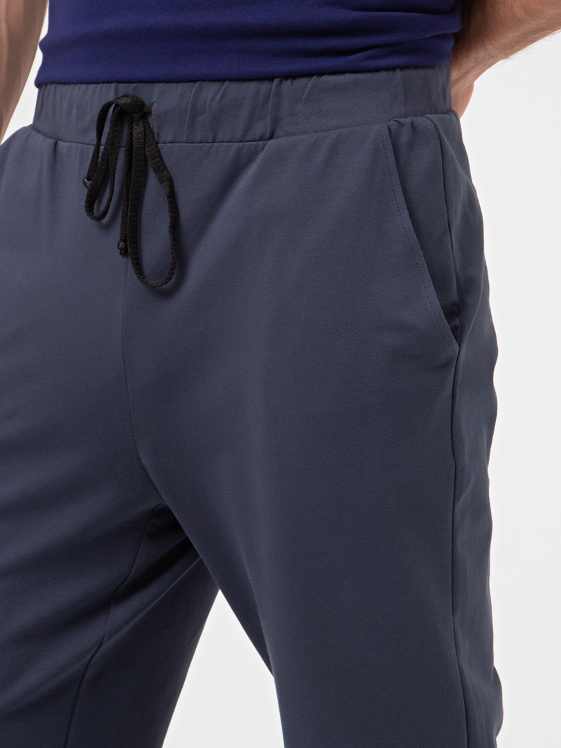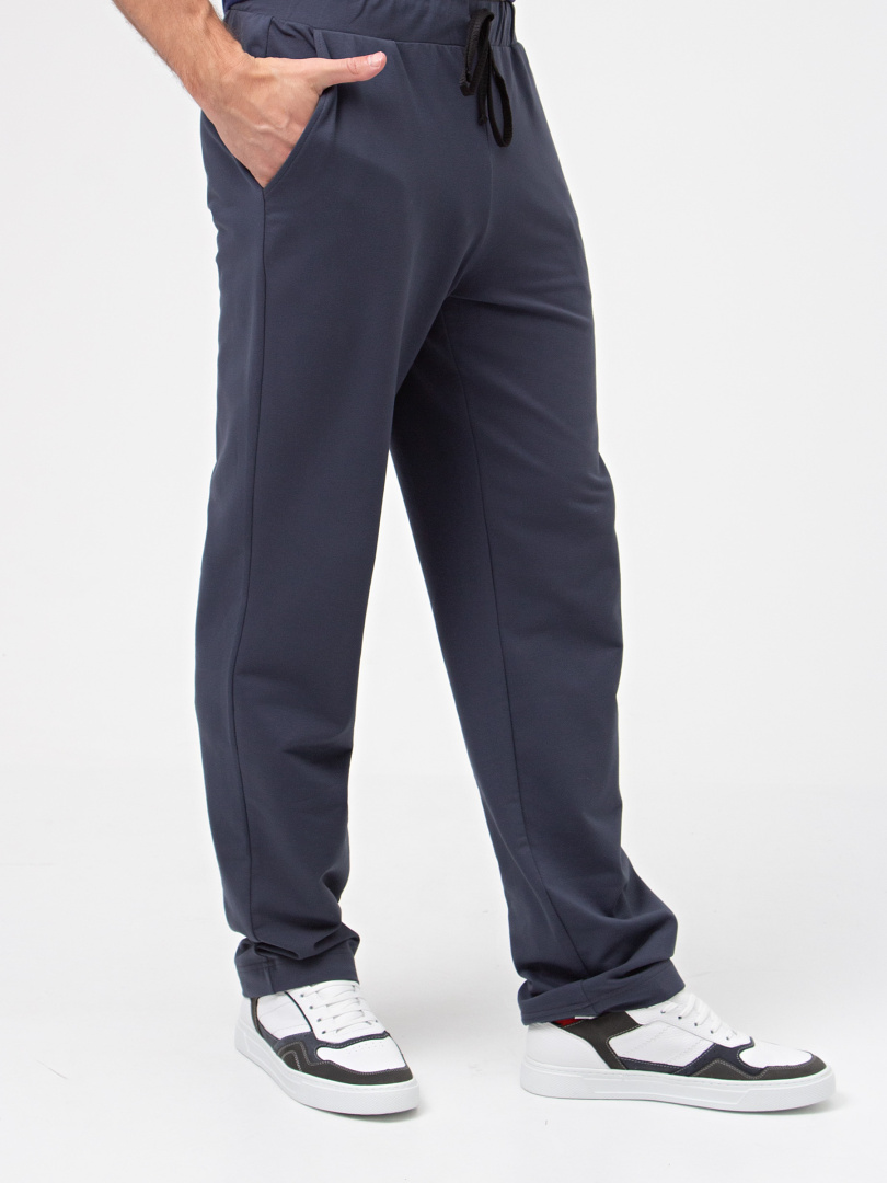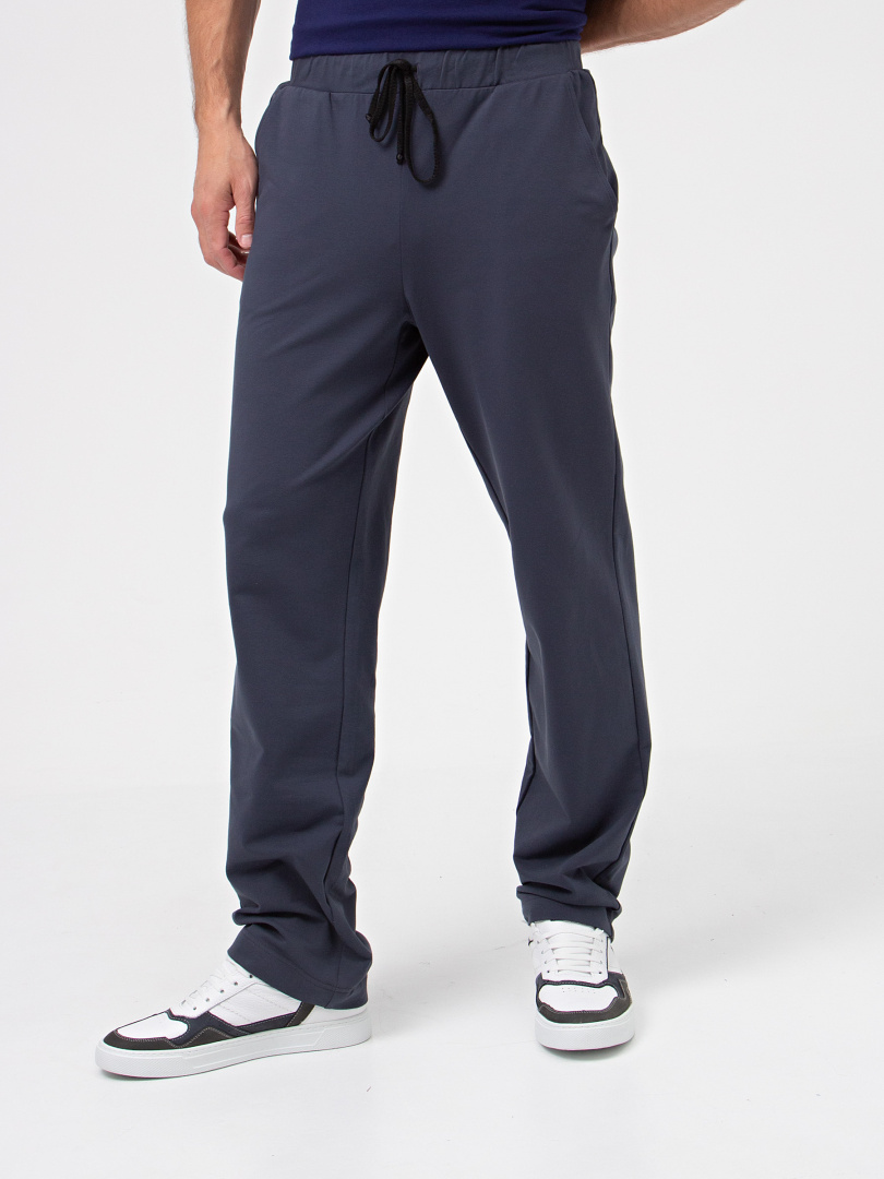 Длинные брюки из плотного эластичного трикотажа. Модель прямого покроя. Притачной пояс с широкой резинкой и шнуром. На передних половинках боковые карманы с наклонным входом.