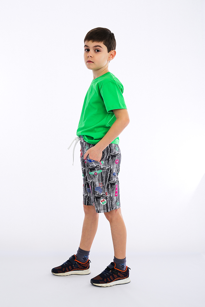 Шорты длиной до колена, выполненные из лёгкого хлопкового трикотажного полотна. Модель с удобной средней посадкой. Пояс на широкой резине со шнуром. На передних половинках боковые карманы с прямым входом.