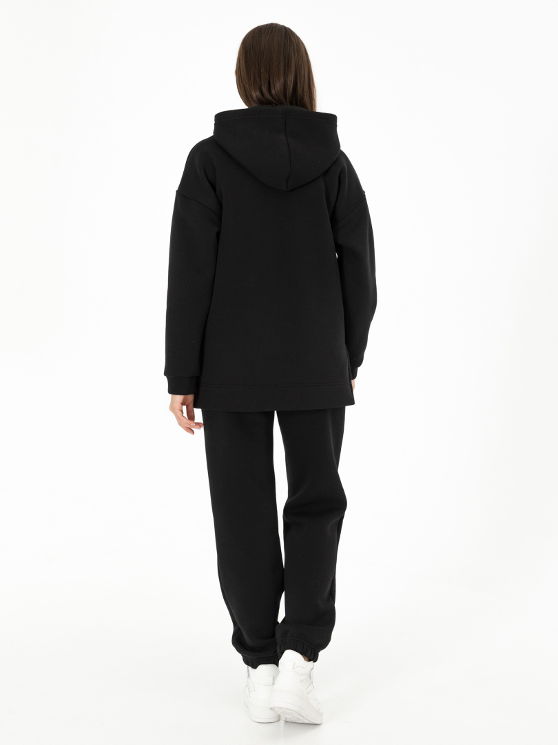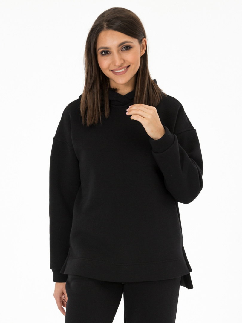 Джемпер средней длины с капюшоном, выполнен из плотного трикотажа с начёсом. Покрой свободный, рукав со спущенным плечом. Низ боковых швов – разрезы. Низ рукавов – манжеты.