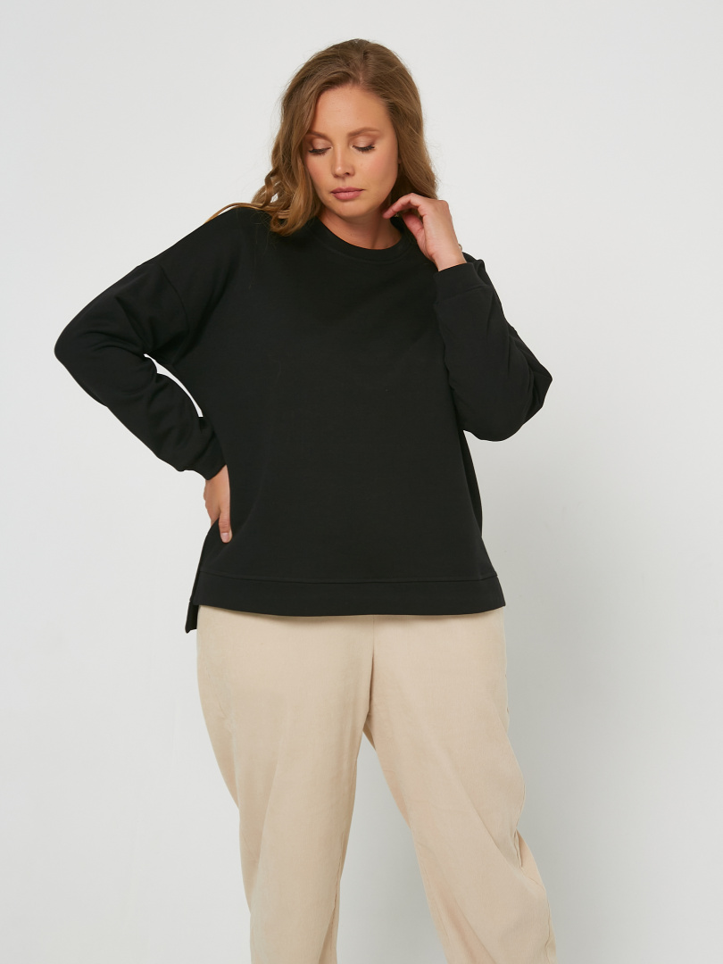 Джемпер средней длины, выполнен из трикотажа. Покрой свободный, рукав со спущенным плечом. Вырез круглый. Низ рукавов – манжеты. Низ джемпера – притачной пояс с разрезами в боковых швах.