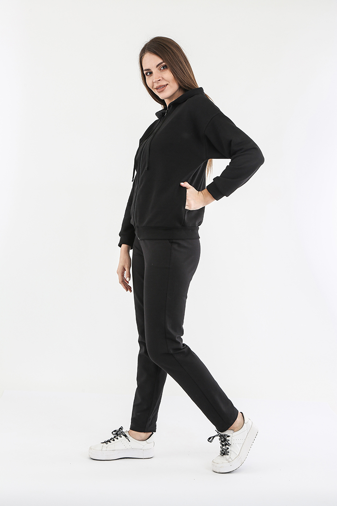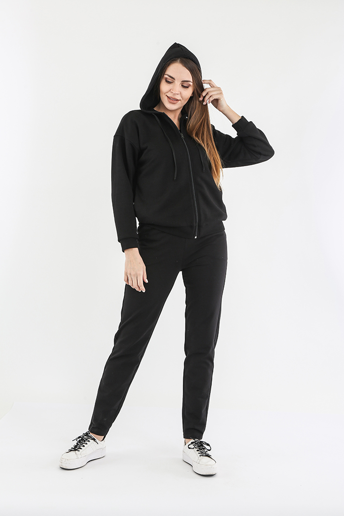Джемпер выполнен из плотного трикотажа. Модель имеет свободный покрой со спущенным плечом и рукавами на манжете. В боковых швах – внутренние карманы. Застёжка – молния. По низу изделия – пояс. Завершает образ модели – капюшон.