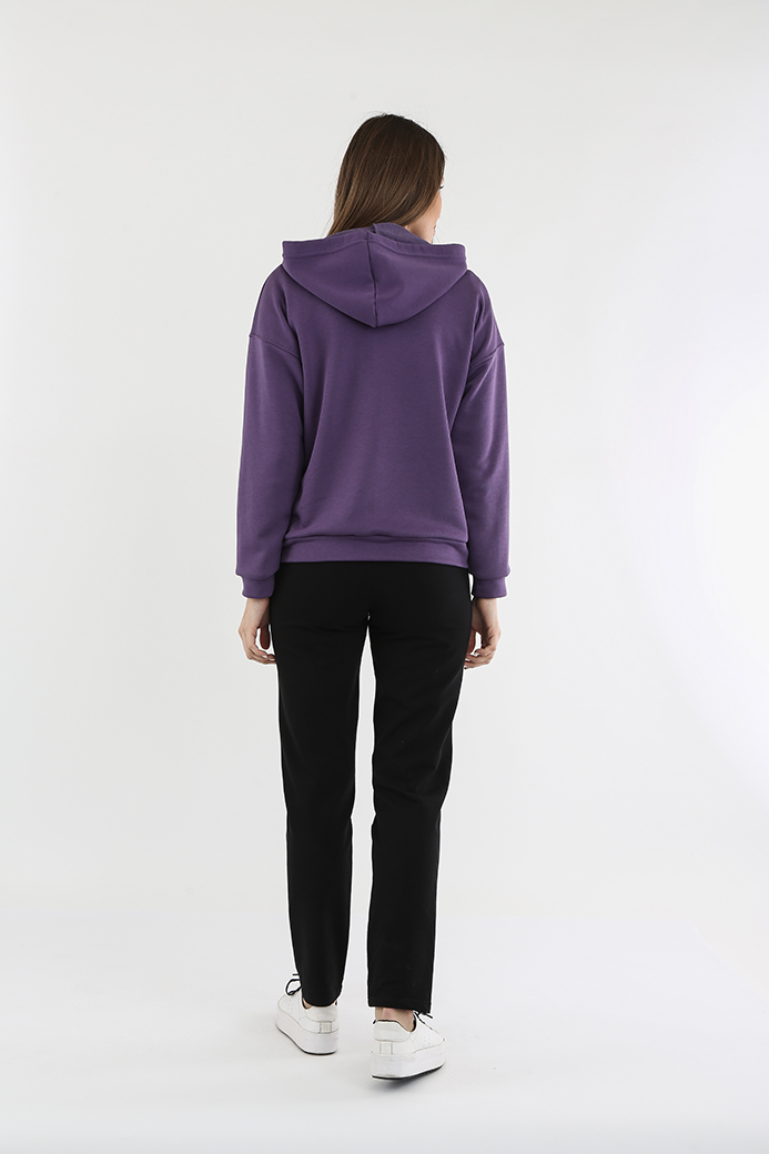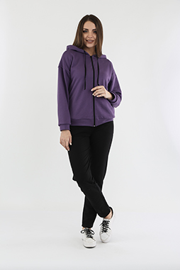 Джемпер выполнен из плотного трикотажа. Модель имеет свободный покрой со спущенным плечом и рукавами на манжете. В боковых швах – внутренние карманы. Застёжка – молния. По низу изделия – пояс. Завершает образ модели – капюшон.