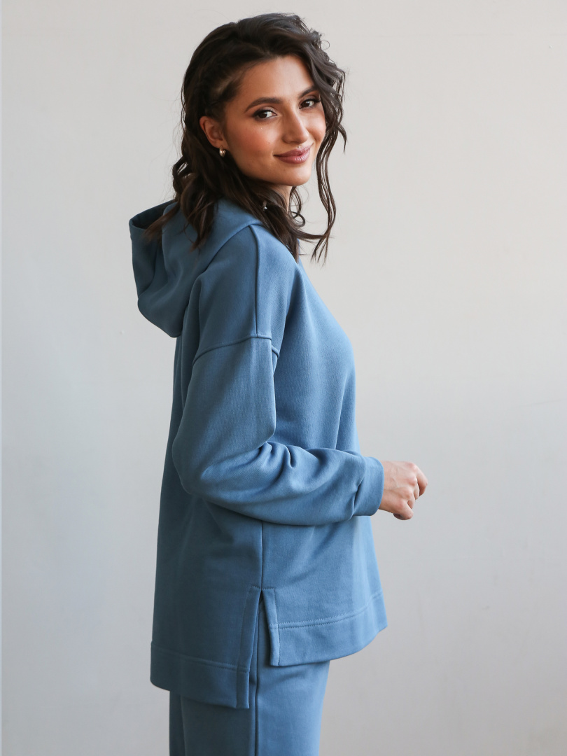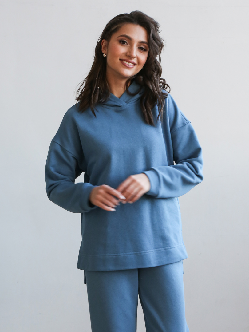Джемпер средней длины с капюшоном, выполнен из плотного трикотажа. Покрой свободный, рукав со спущенным плечом. Низ боковых швов – разрезы. Низ рукавов – манжеты.