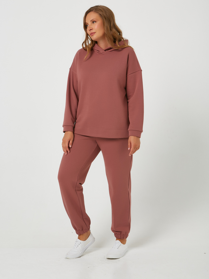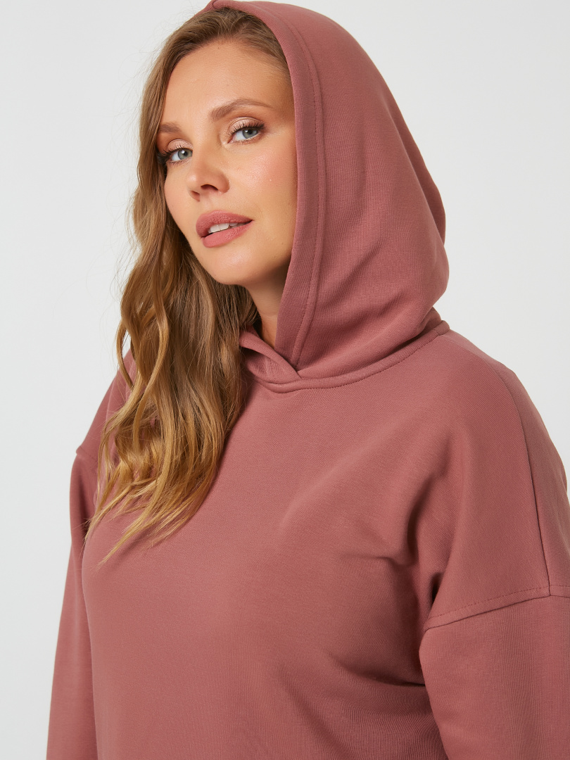Джемпер средней длины с капюшоном, выполнен из плотного трикотажа. Покрой свободный, рукав со спущенным плечом. Низ боковых швов – разрезы. Низ рукавов – манжеты.