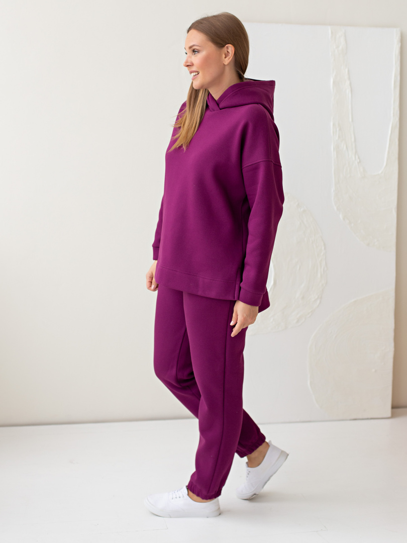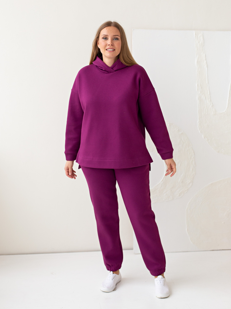 Джемпер средней длины с капюшоном, выполнен из плотного трикотажа с начёсом. Покрой свободный, рукав со спущенным плечом. Низ боковых швов – разрезы. Низ рукавов – манжеты.