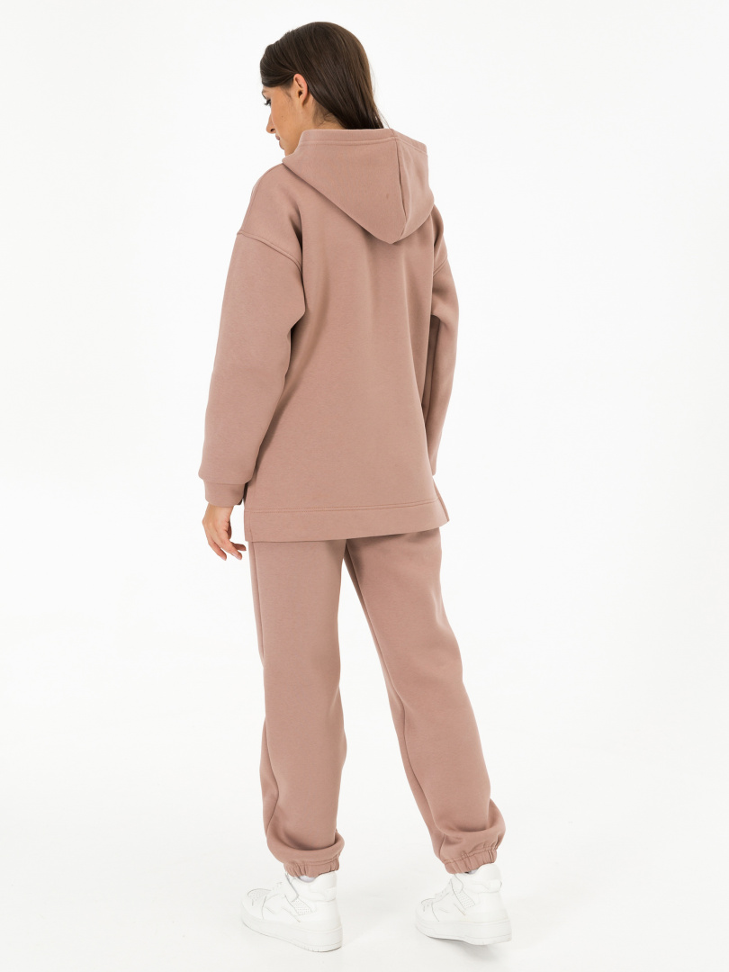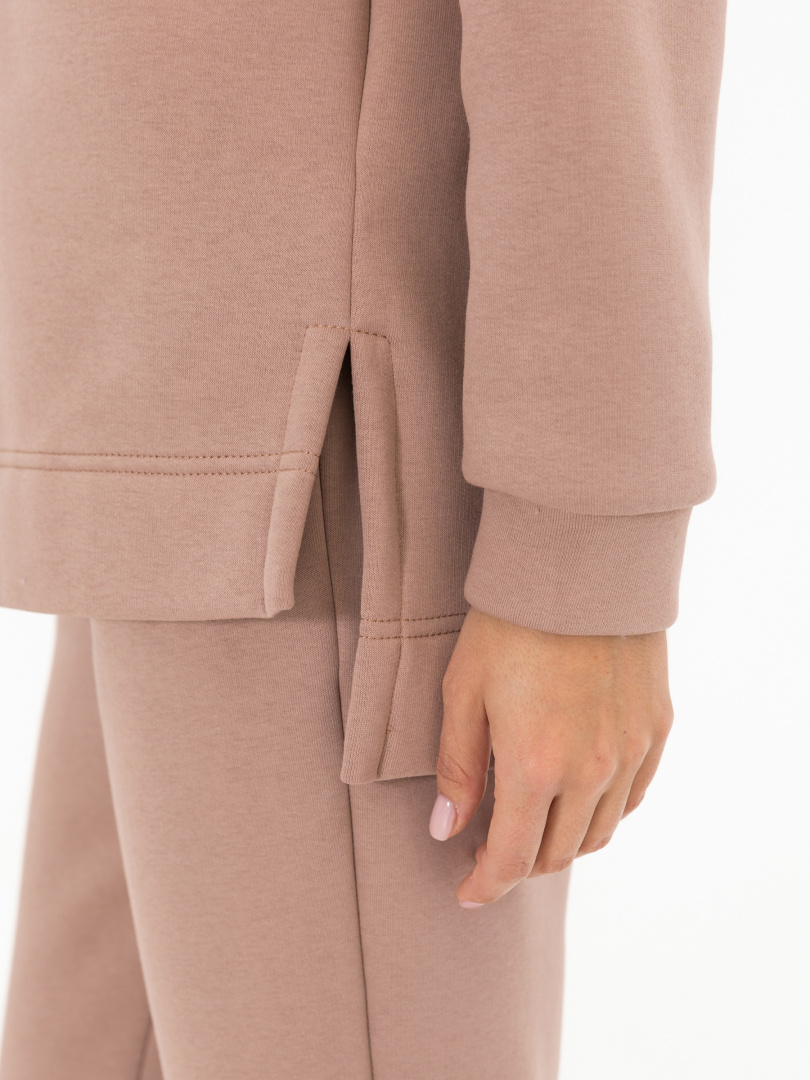 Джемпер средней длины с капюшоном, выполнен из плотного трикотажа с начёсом. Покрой свободный, рукав со спущенным плечом. Низ боковых швов – разрезы. Низ рукавов – манжеты.