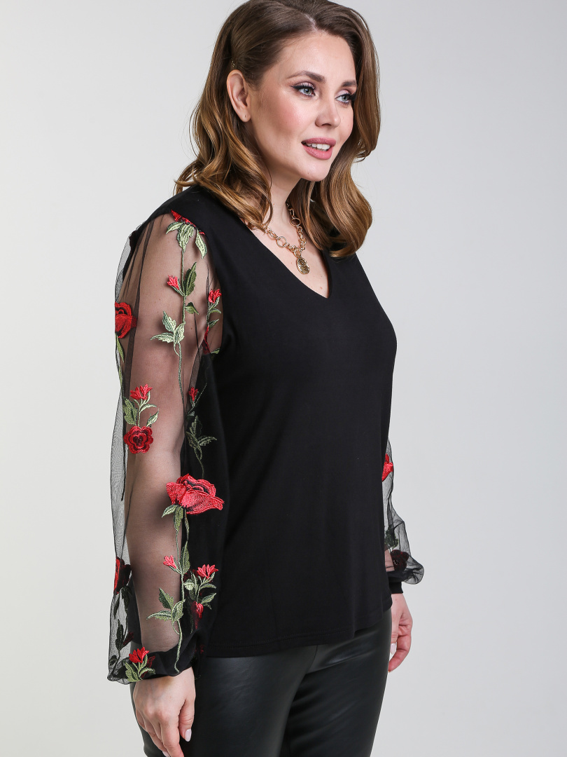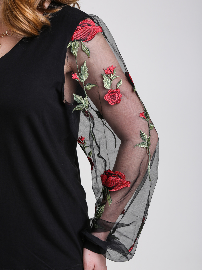 Джемпер средней длины из трикотажа. Покрой прямой с V-образным вырезом. Рукава выполнены из сетки. Длинный втачной рукав со сборкой по низу на манжете и сборкой по окату рукава.