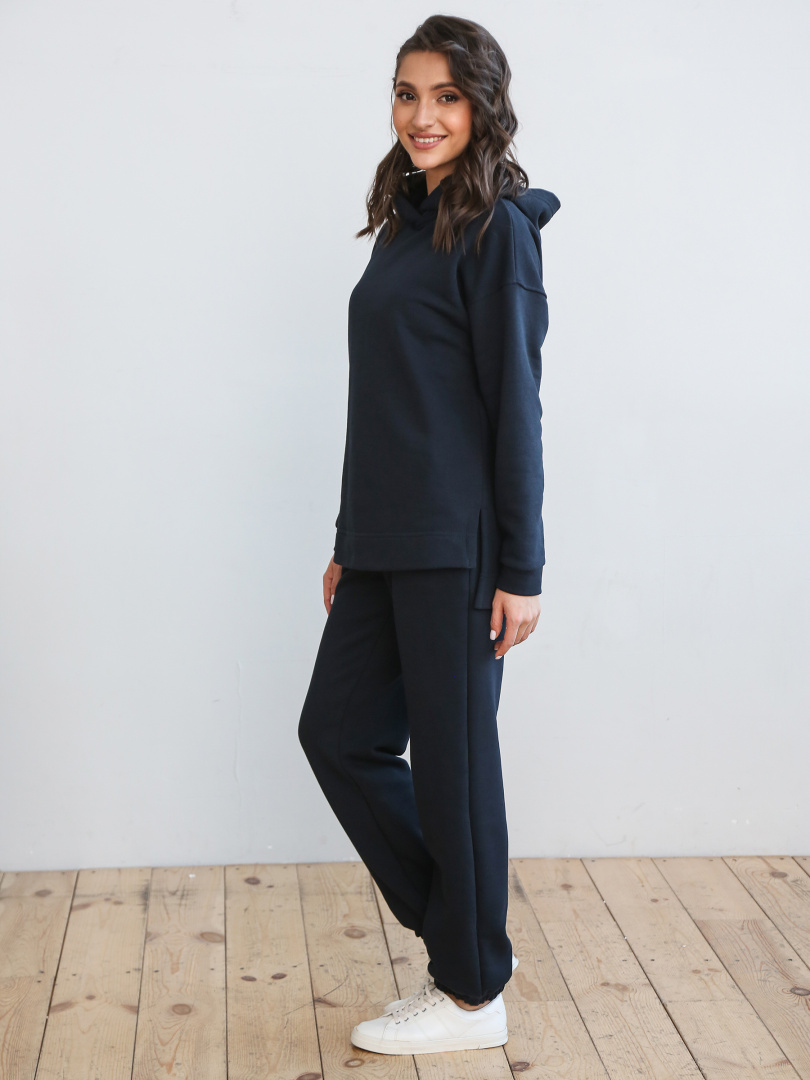 Джемпер средней длины с капюшоном, выполнен из плотного трикотажа. Покрой свободный, рукав со спущенным плечом. Низ боковых швов – разрезы. Низ рукавов – манжеты.