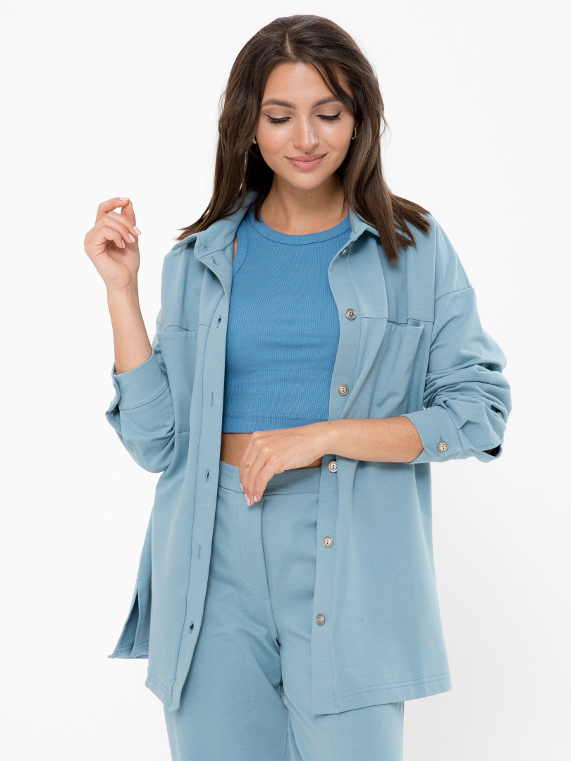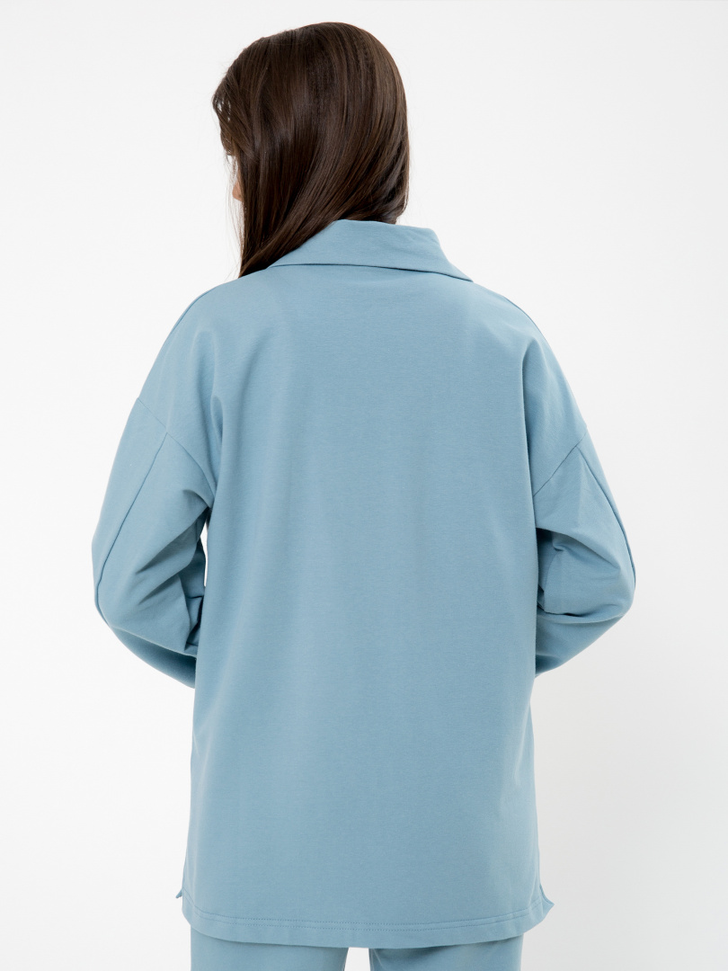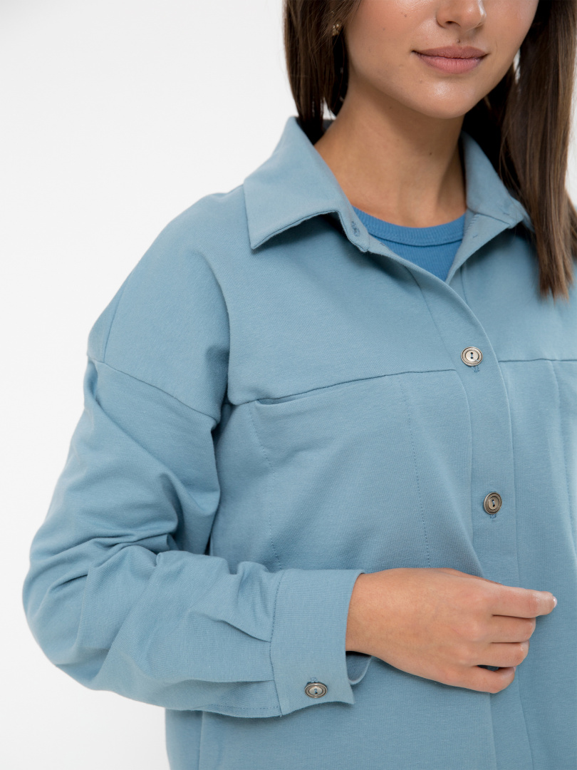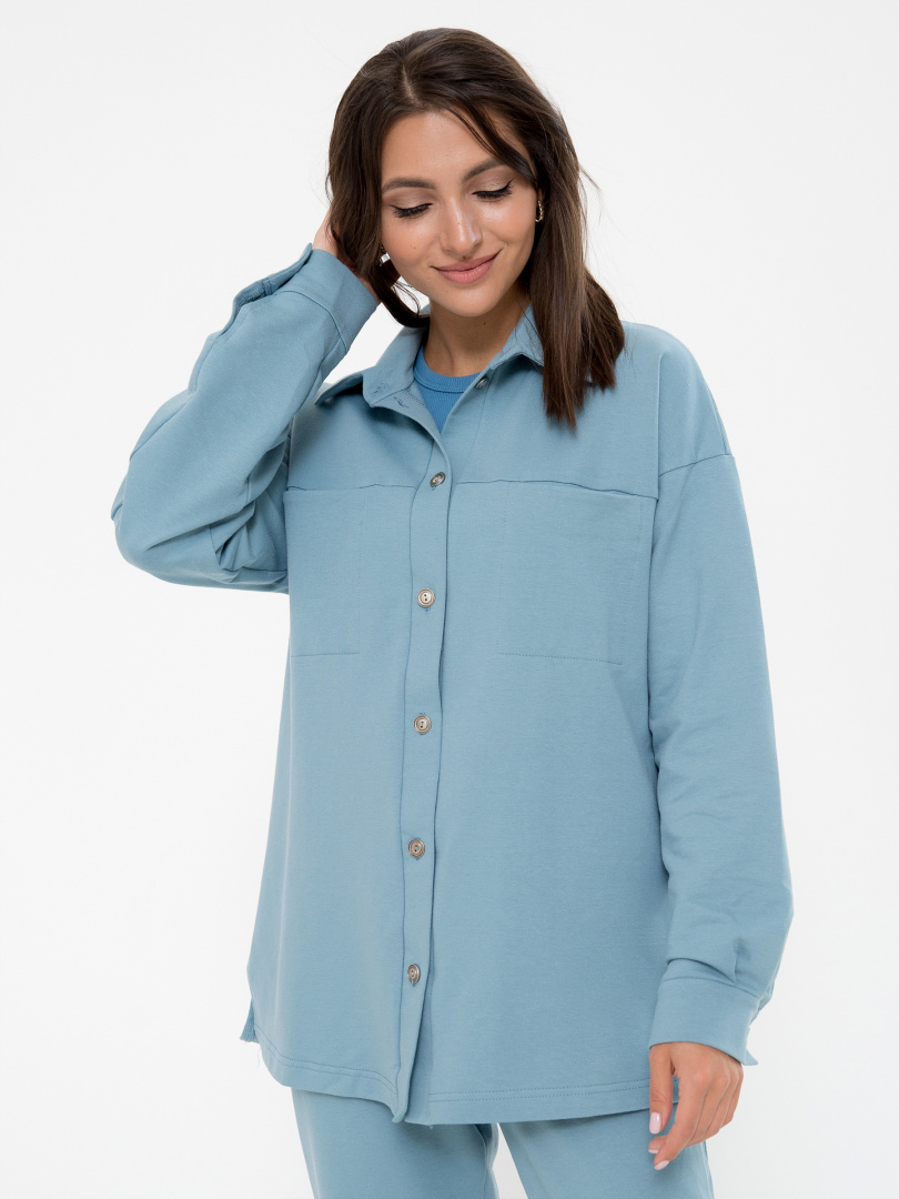 Джемпер-рубашка средней длины выполнен из плотного трикотажа. Покрой прямой свободный с длинным  рукавом. Воротник сорочечный с цельнокроеной стойкой. Рукав двухшовный с разрезами по низу. Низ рукавов – манжеты с застёжкой на петлю и пуговицу. По переду – карманы в швах кокетки, настроченные на перед. Застежка-планка на 6 петель и пуговиц.