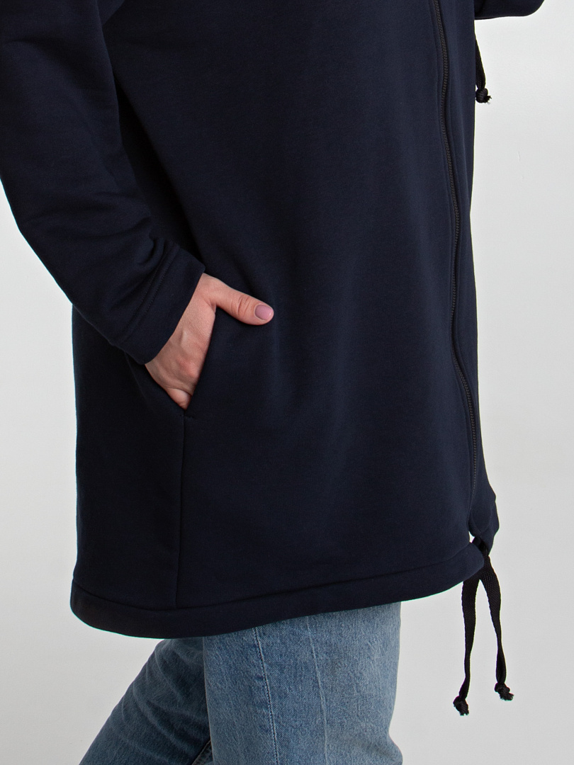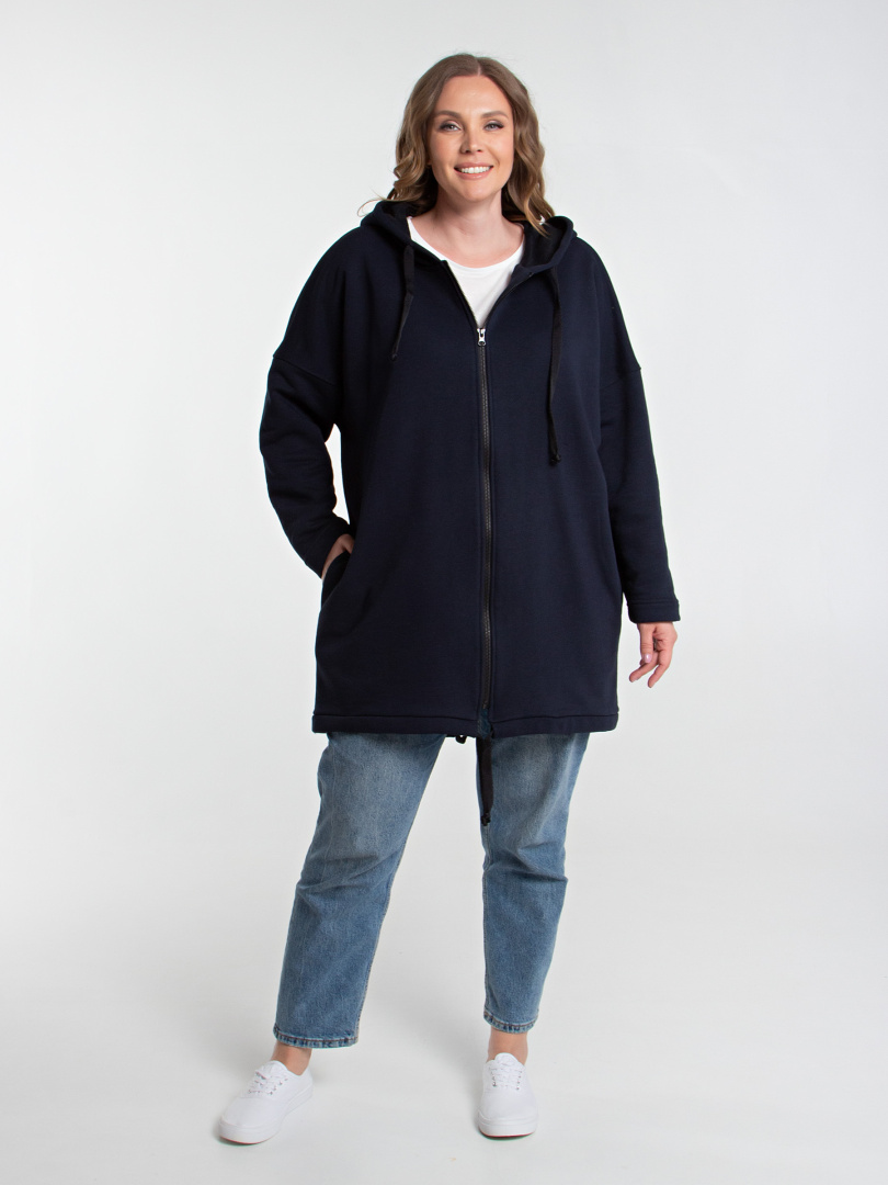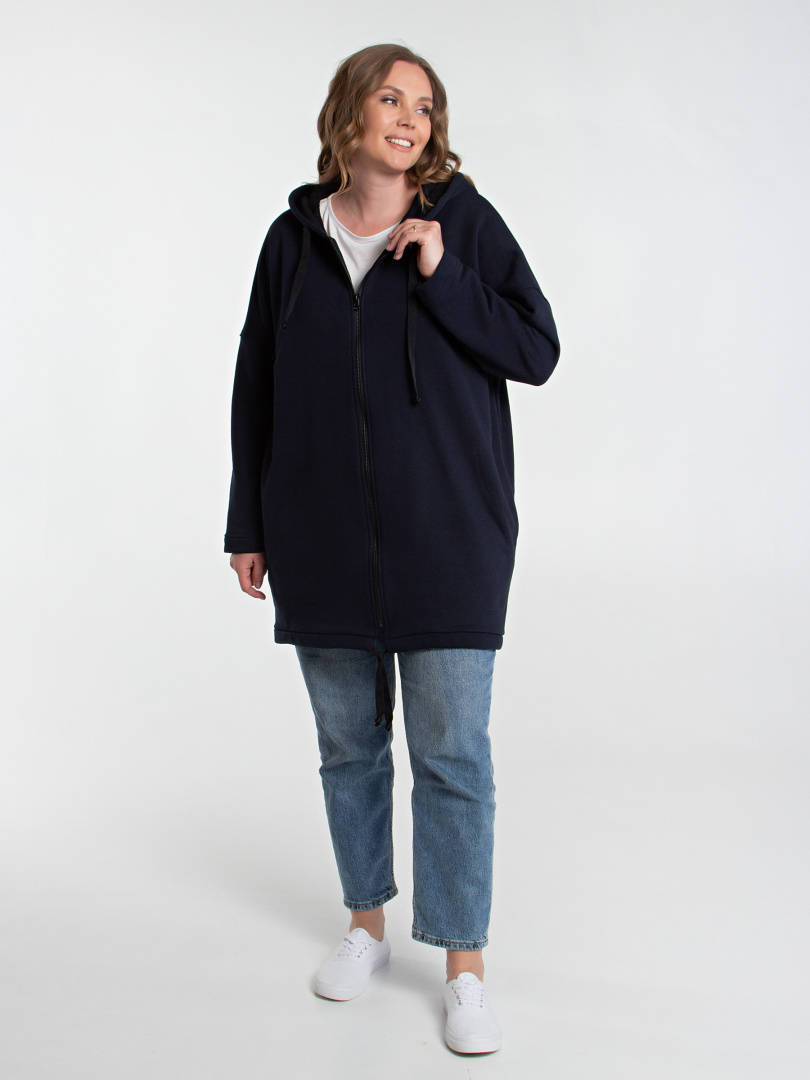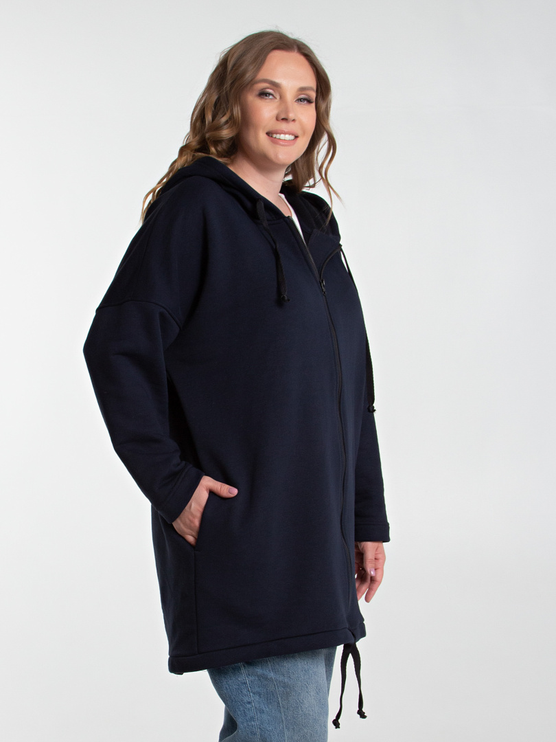 Удлинённый кардиган выполнен из плотного трикотажа. Модель имеет оригинальный свободный покрой со спущенным плечом и прямым рукавом.  В боковых швах – внутренние карманы. Застёжка – молния. По низу изделия – кулиска со шнуром и декоративный вырез по низу спинки.  Завершает образ модели – капюшон.