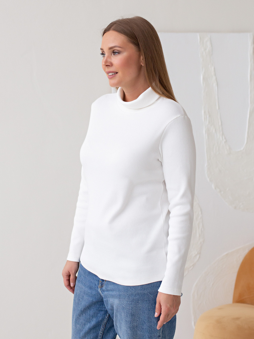 Джемпер прилегающего силуэта из эластичного трикотажа. Модель средней длины. Горловина имеет растяжимый воротник-стойку.