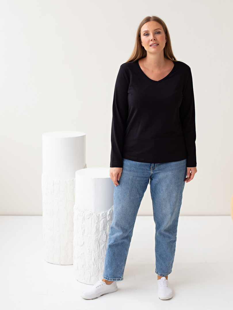 Блуза средней длины прилегающего силуэта из тонкого хлопка с лайкрой. Модель имеет длинный рукав и V-образный вырез горловины. Низ боковых швов оформлен разрезами.