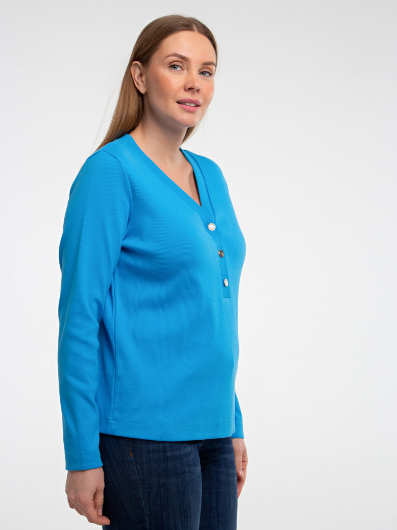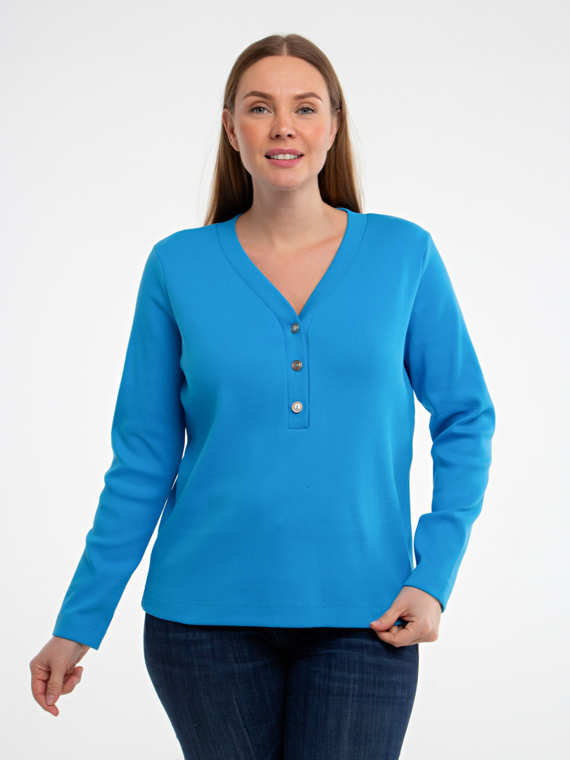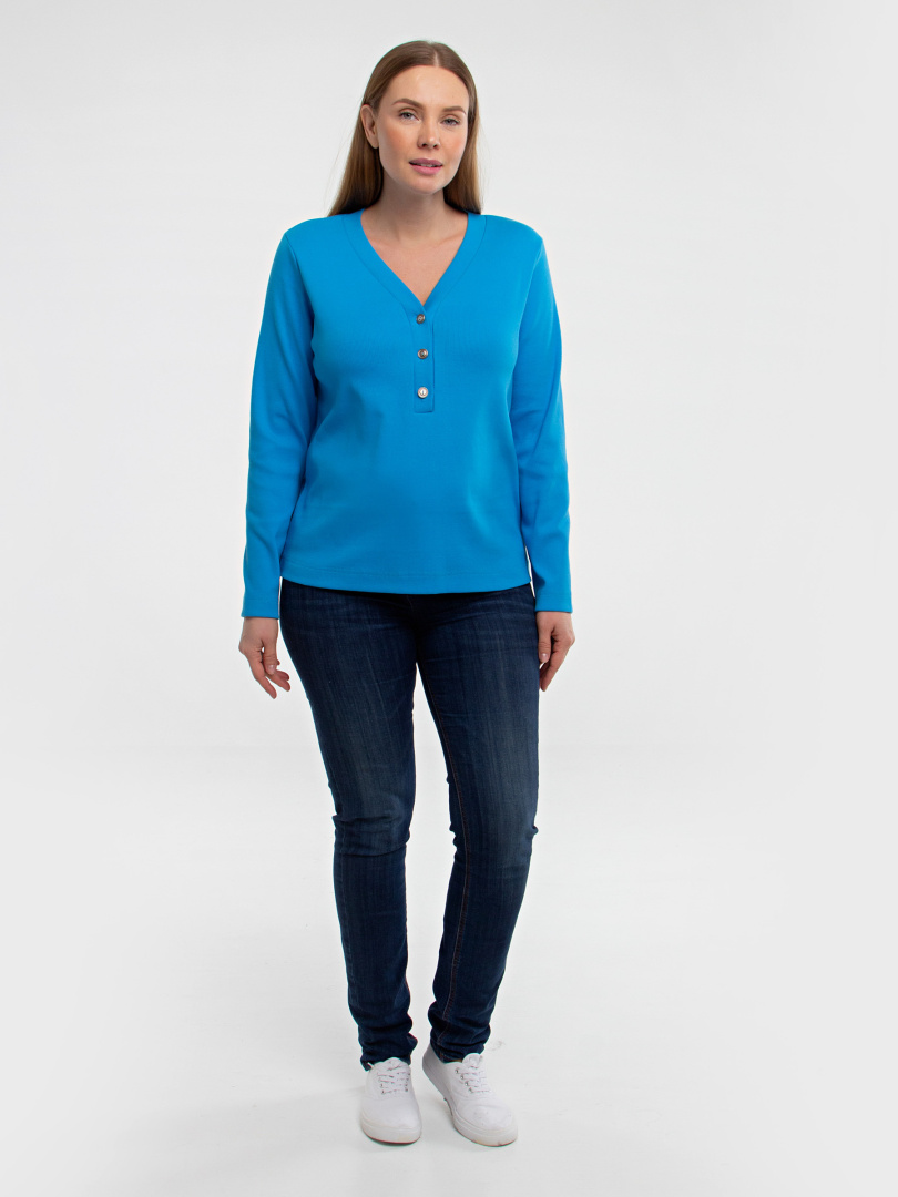 Джемпер прямого силуэта из эластичного трикотажа. Рукав длинный. V-образный вырез горловины обработан обтачкой, переходящей в планку с застежкой на пуговицы.