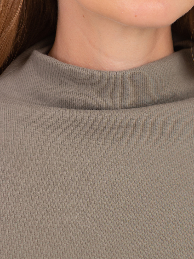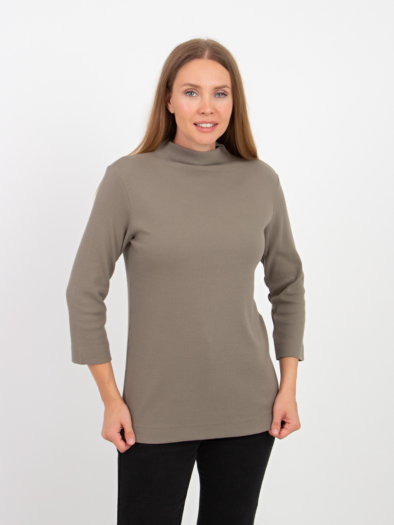 Джемпер средней длины, выполнен из мягкого эластичного трикотажа. Покрой прямой. Рукав втачной 3/4. Воротник – цельнокроеная стойка.