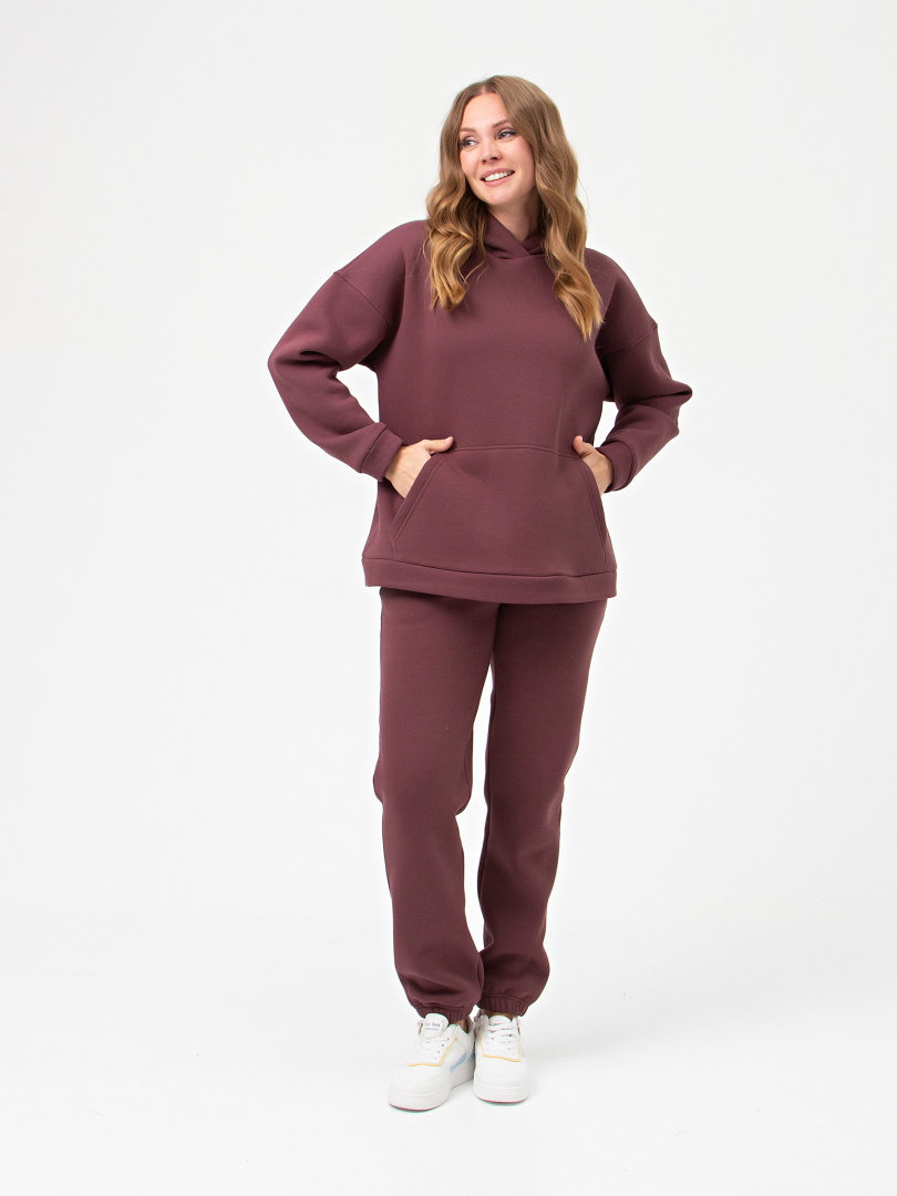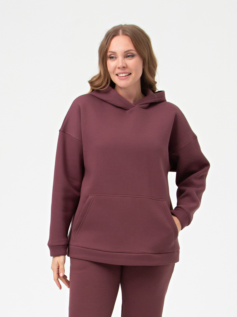 Джемпер средней длины с капюшоном, выполнен из плотного трикотажа с начесом. Покрой свободный, рукав со спущенным плечом. По переду - карман. Низ рукавов – манжеты. Низ джемпера – притачной пояс.