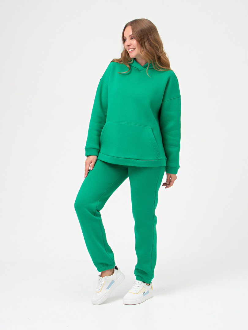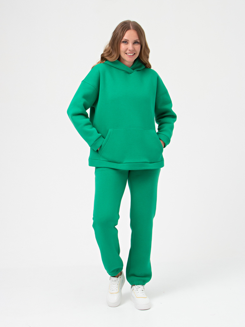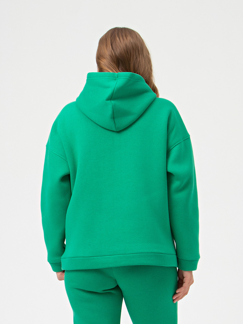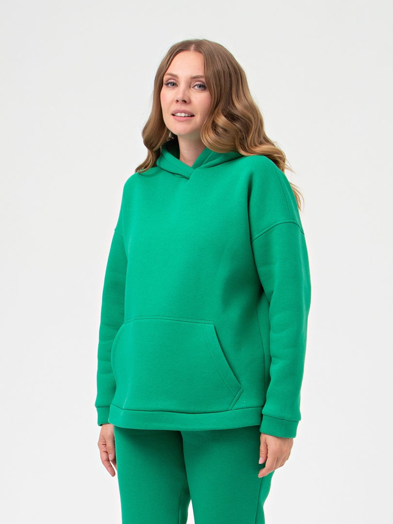 Джемпер средней длины с капюшоном, выполнен из плотного трикотажа с начесом. Покрой свободный, рукав со спущенным плечом. По переду - карман. Низ рукавов – манжеты. Низ джемпера – притачной пояс.