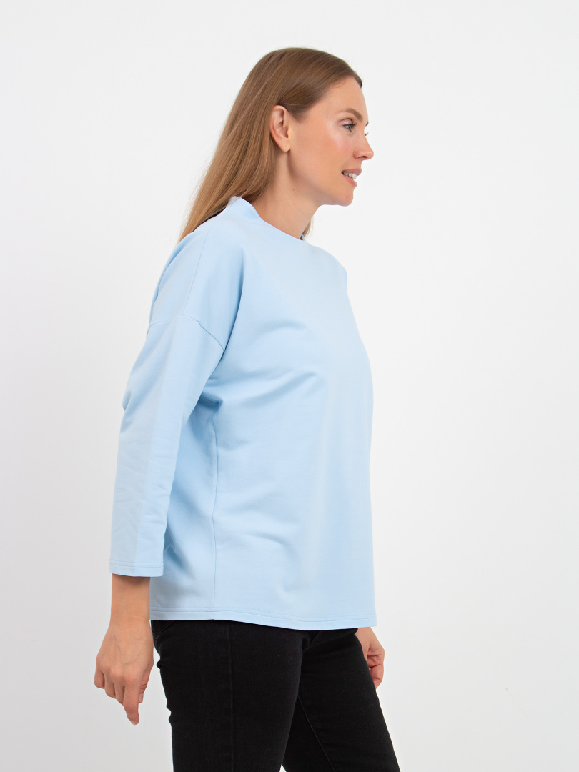 Джемпер прямого силуэта с рукавом 3/4. Вырез горловины круглый, переходящий в небольшую стойку.