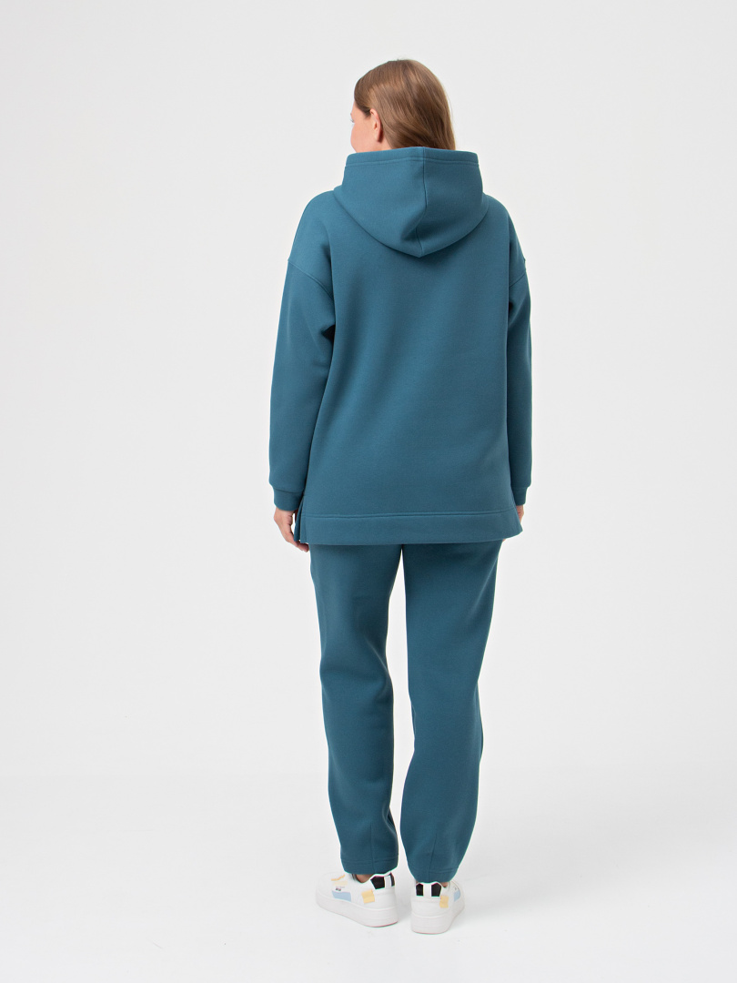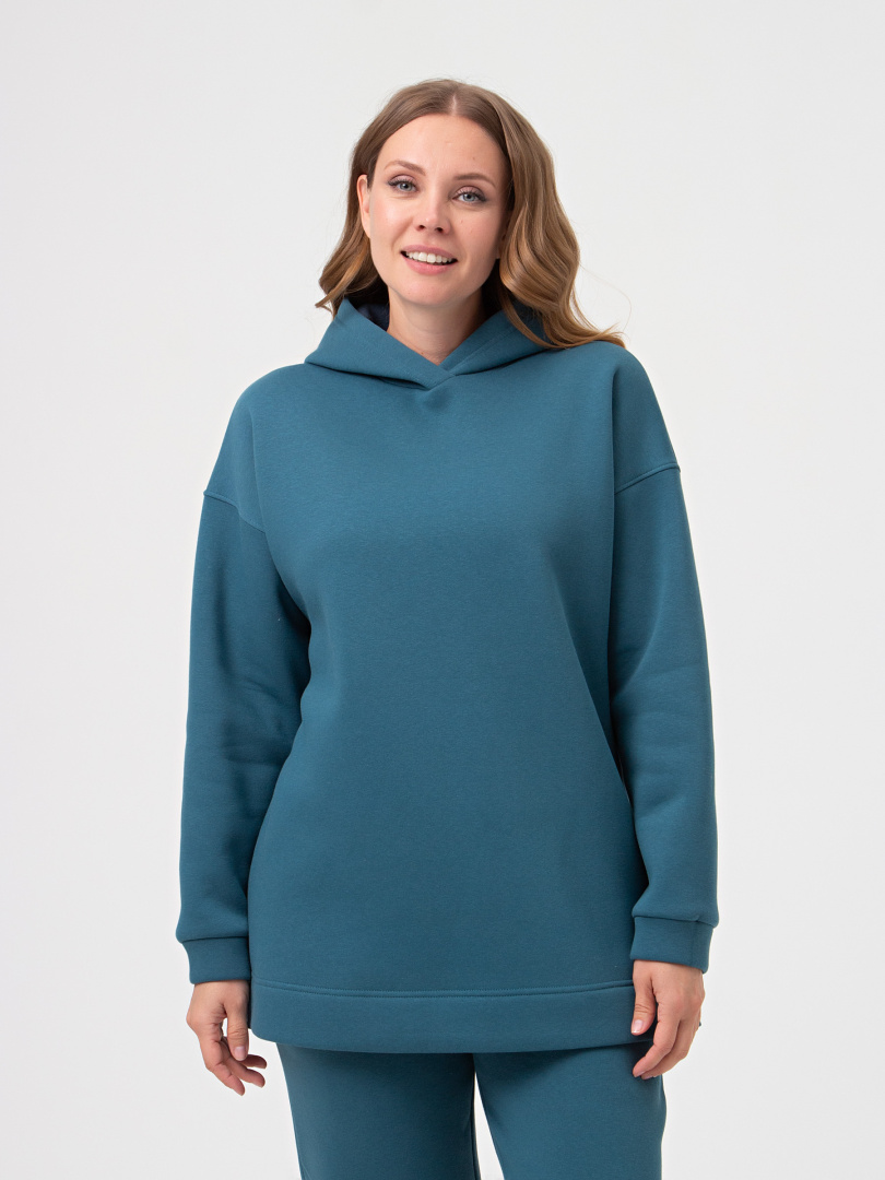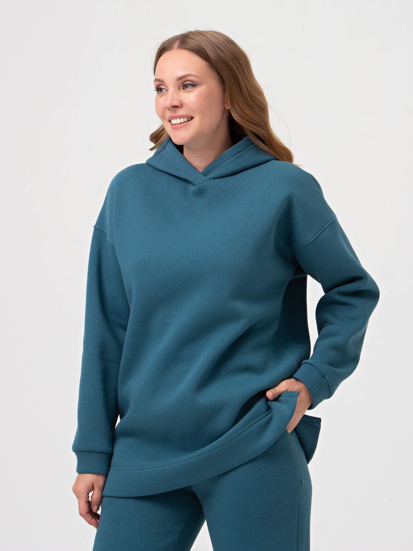 Джемпер средней длины с капюшоном, выполнен из плотного трикотажа с начёсом. Покрой свободный, рукав со спущенным плечом. Низ боковых швов – разрезы. Низ рукавов – манжеты.