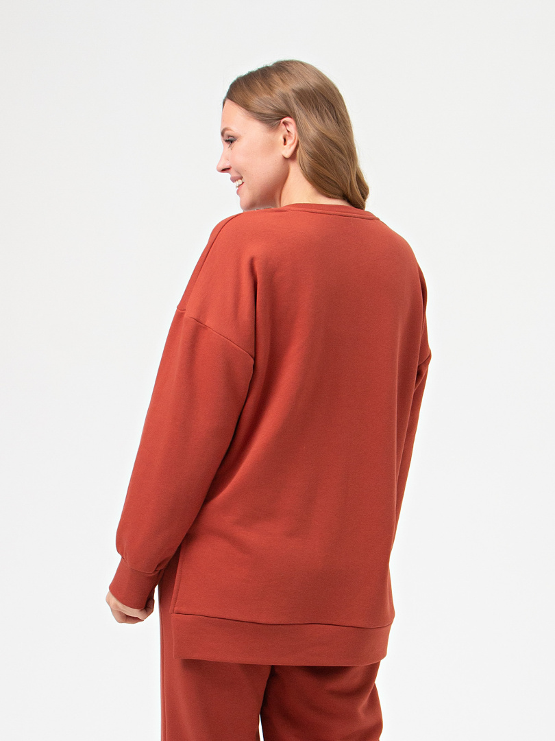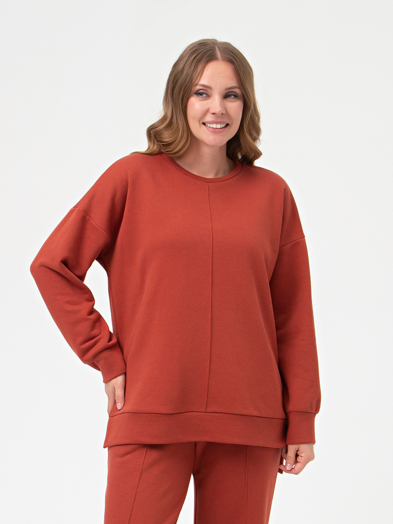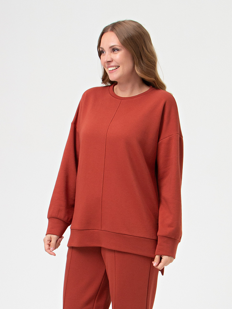 Джемпер удлиненный выполнен из плотного мягкого трикотажа. Покрой свободный, рукав со спущенным плечом. Низ рукавов собран на манжету. В боковых швах – разрезы. Низ джемпера – притачной пояс. Горловина круглая. Посередине переда узкая складка.