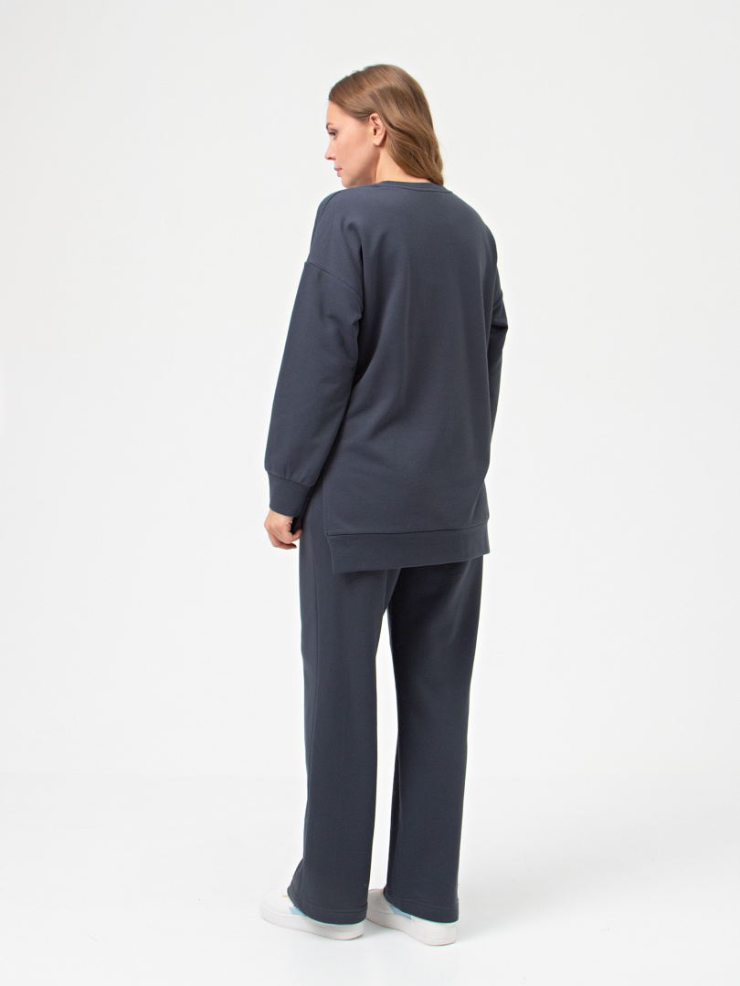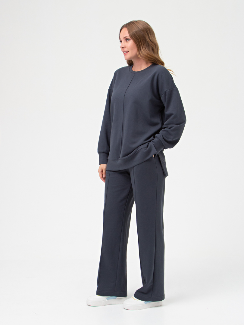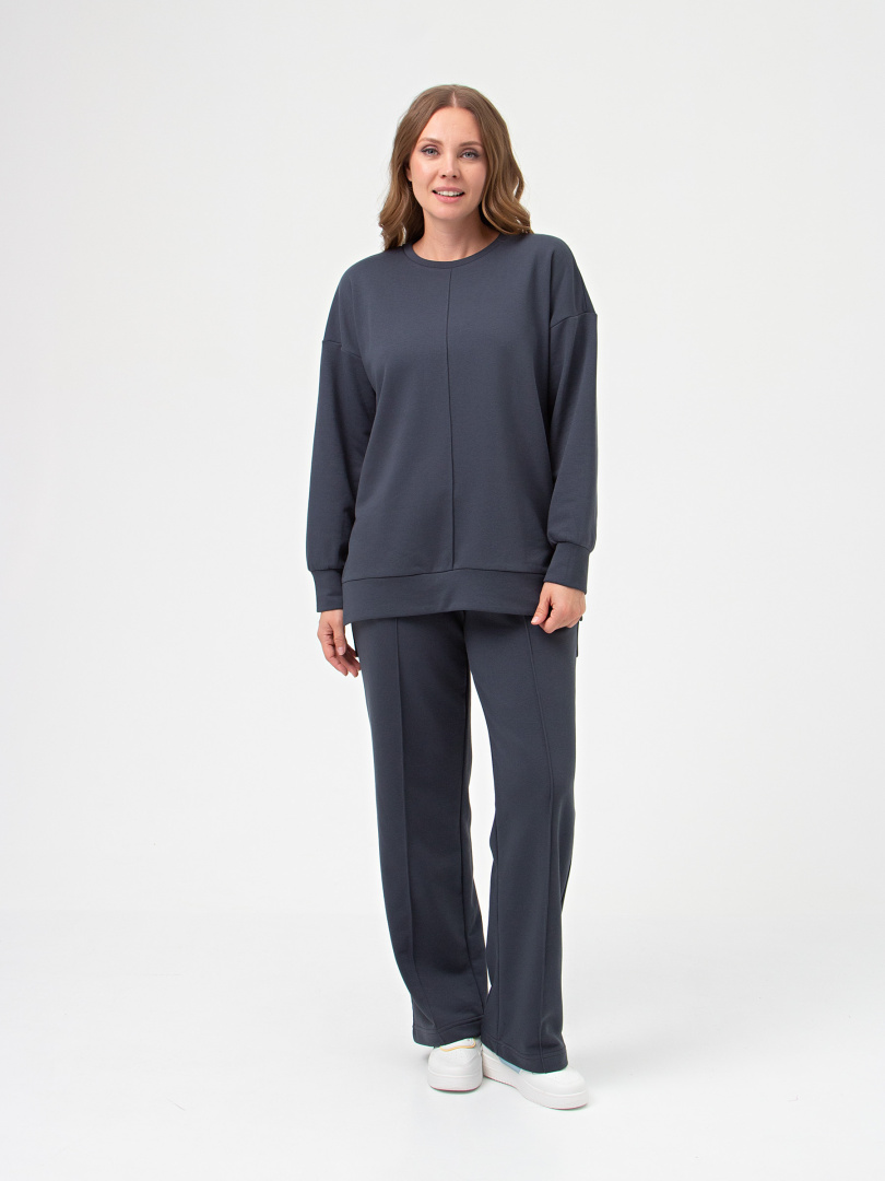 Джемпер удлиненный выполнен из плотного мягкого трикотажа. Покрой свободный, рукав со спущенным плечом. Низ рукавов собран на манжету. В боковых швах – разрезы. Низ джемпера – притачной пояс. Горловина круглая. Посередине переда узкая складка.