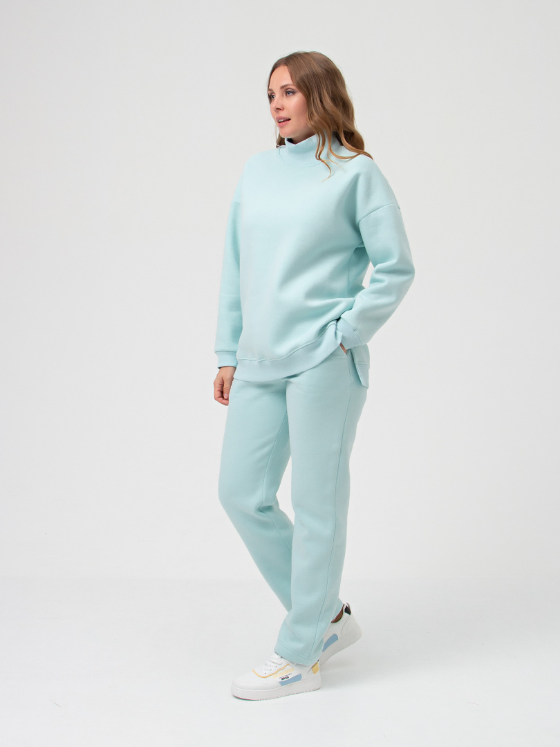 Джемпер средней длины выполнен из плотного трикотажа с начёсом. Покрой свободный, рукав со спущенным плечом. Воротник-стойка. Низ боковых швов – разрезы. По низу изделия - пояс. Низ рукавов – манжеты.