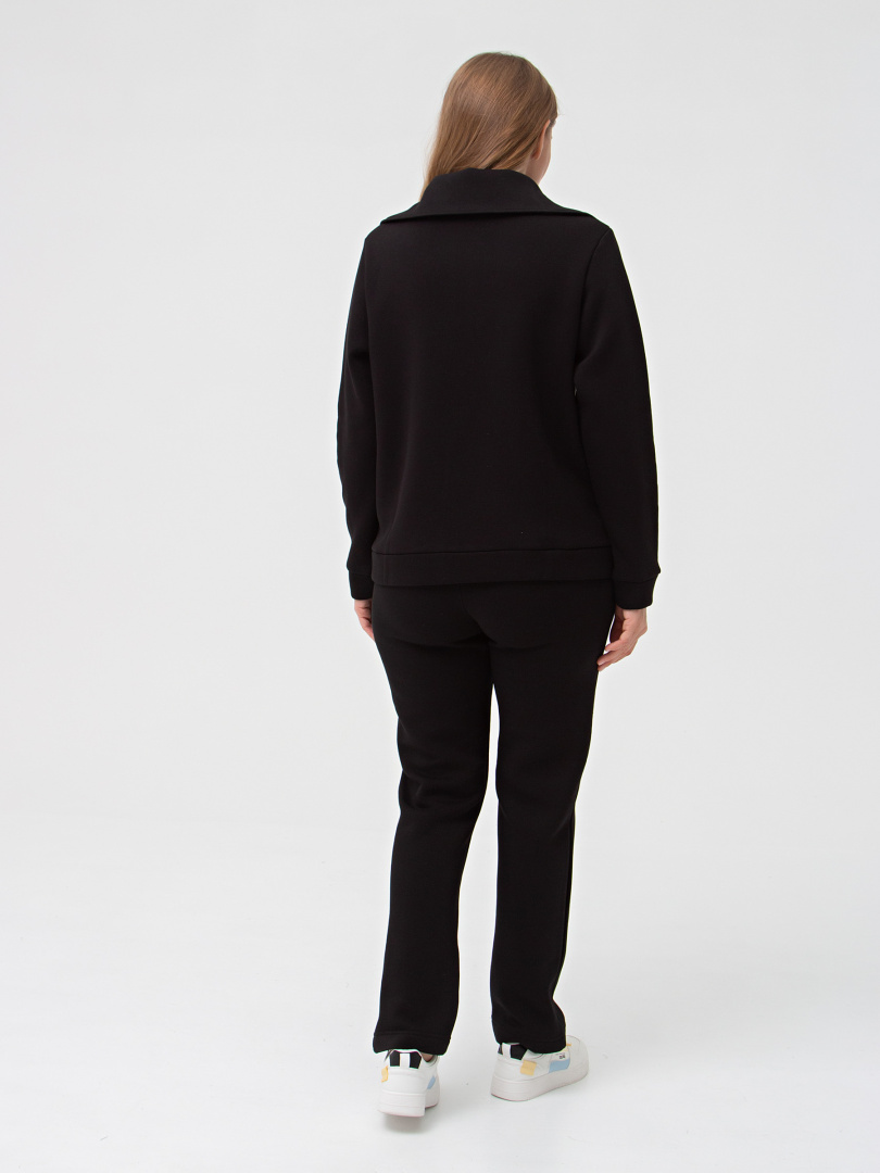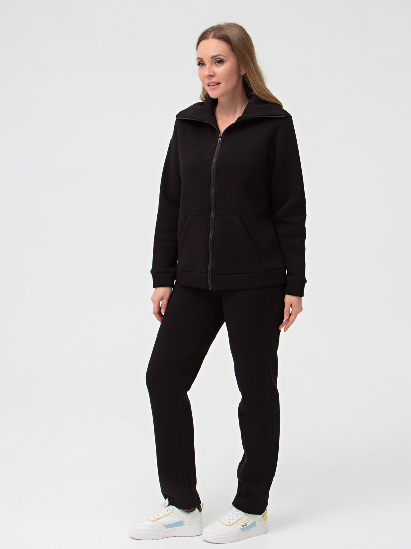 Джемпер средней длины выполнен из плотного футера с начёсом с застежкой на молнию. Покрой прямой, рукав втачной. Воротник – высокая стойка с отворотом. На переде – накладные карманы. По низу изделия - пояс. Низ рукавов – манжеты.