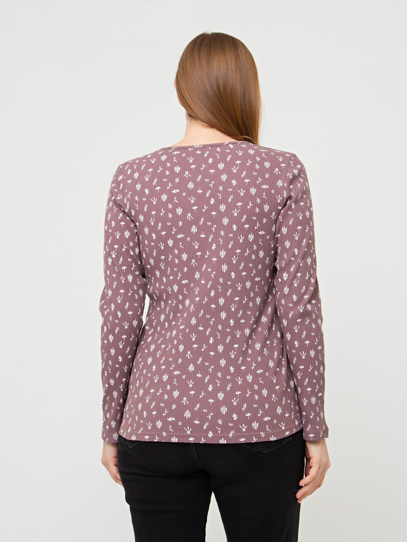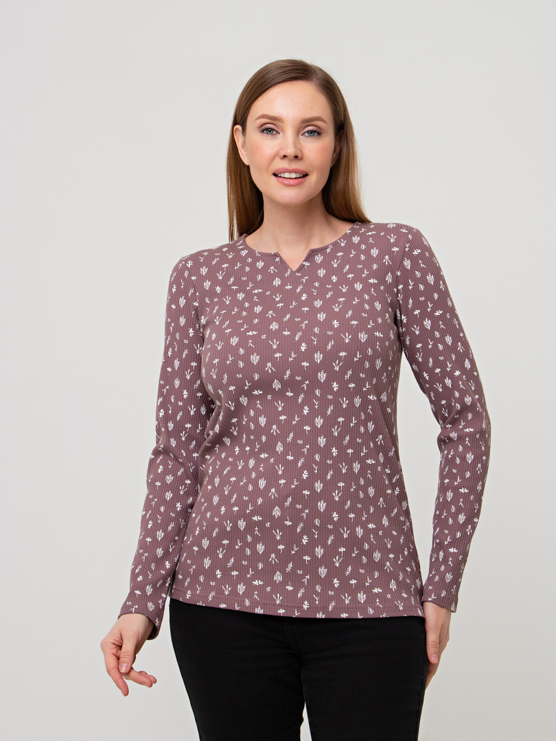 Джемпер прилегающего силуэта из эластичного трикотажа в рубчик. Модель средней длины. Горловина круглая с фигурным вырезом.