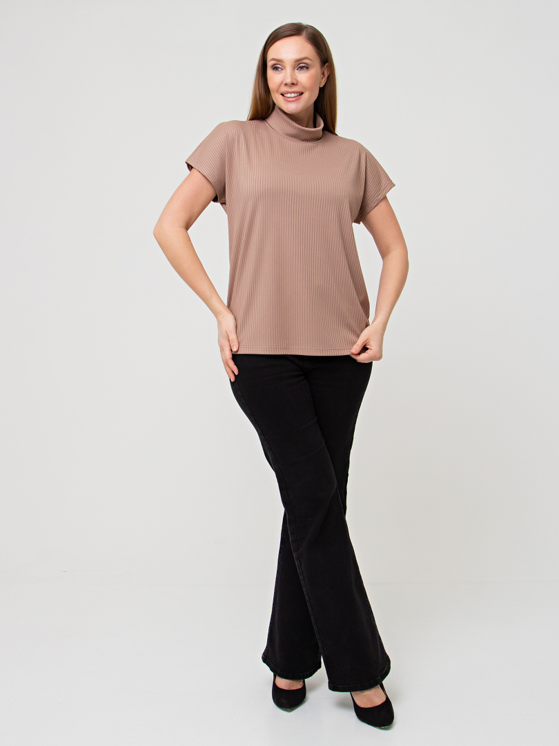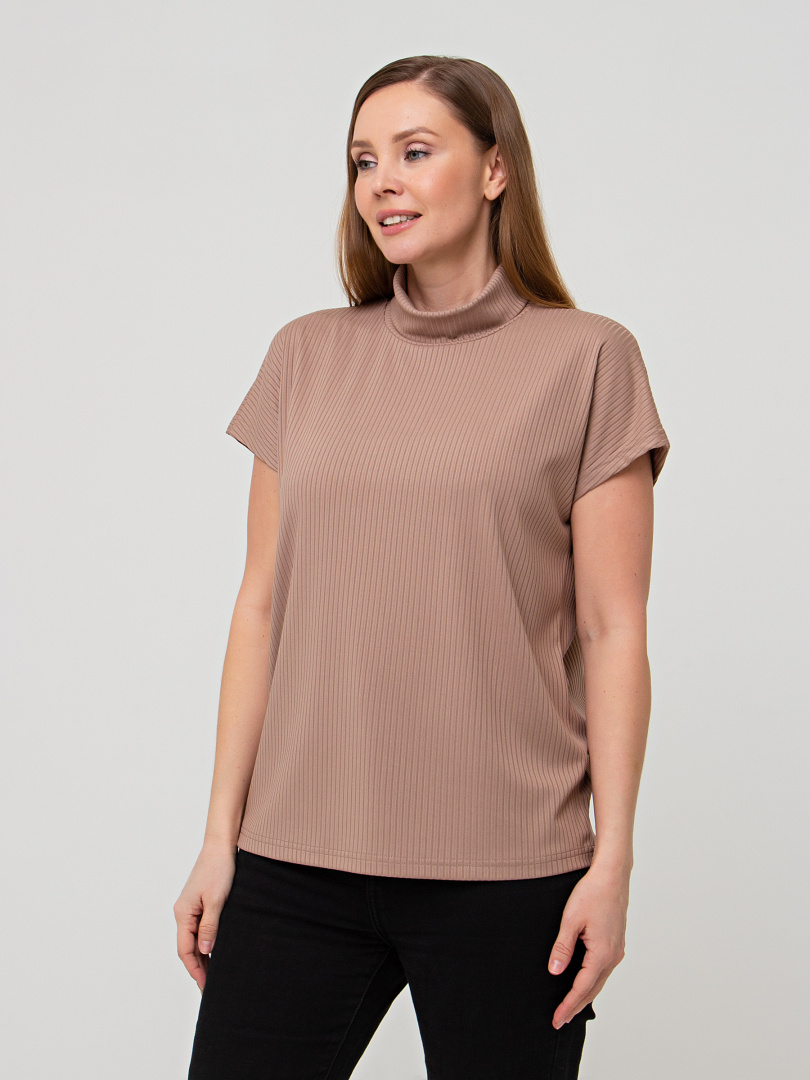 Джемпер прямого силуэта из трикотажа с рукавом кимоно. Модель средней длины. Горловина имеет растяжимый воротник-стойку.
