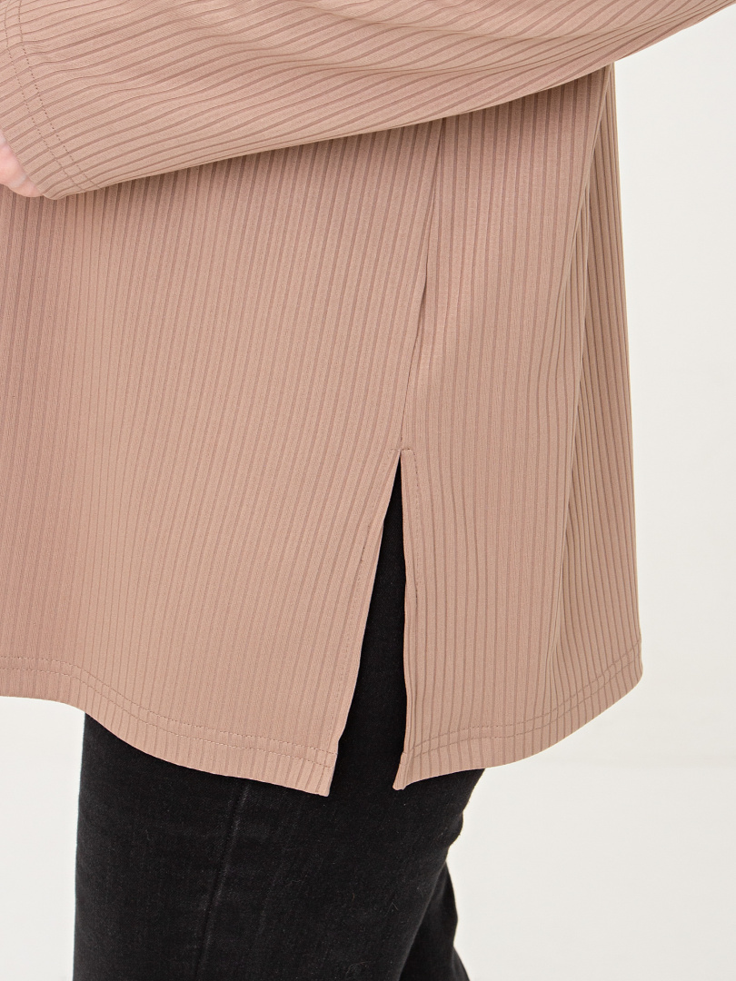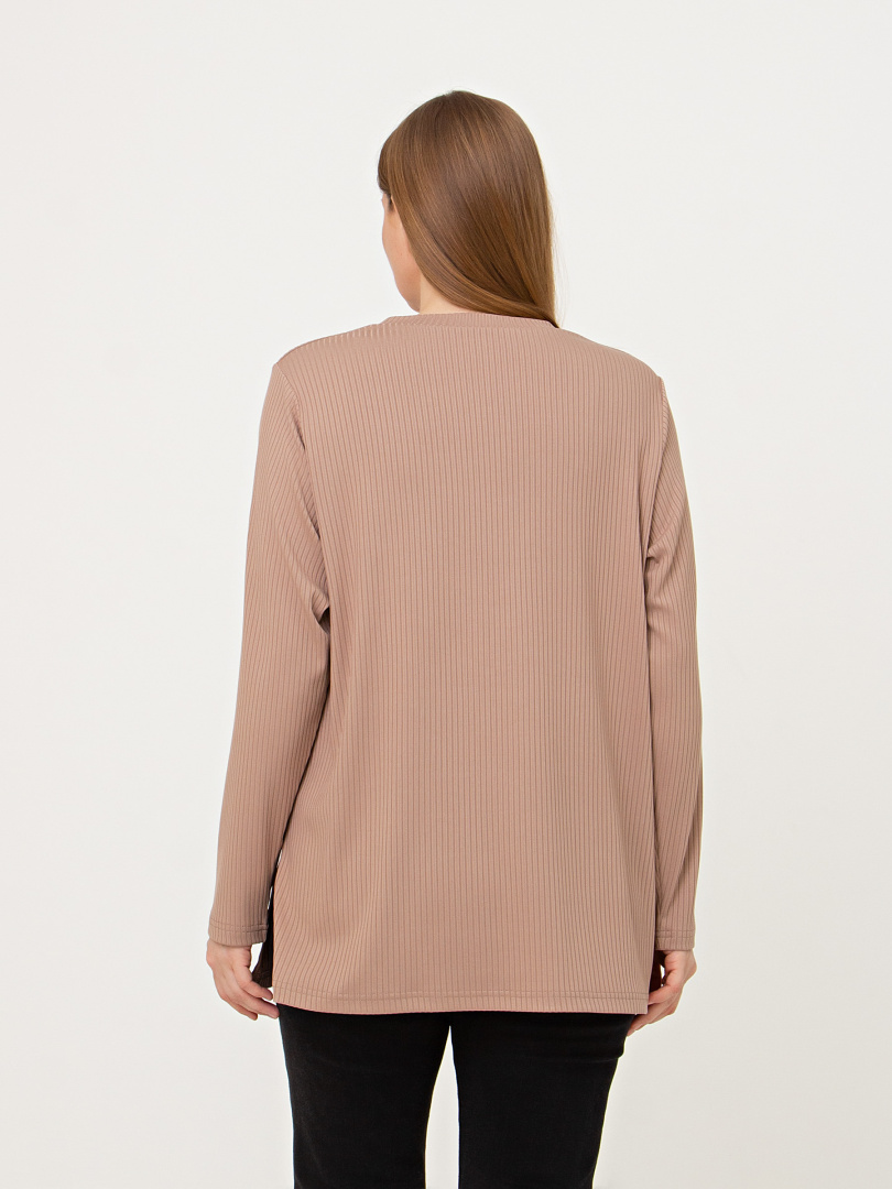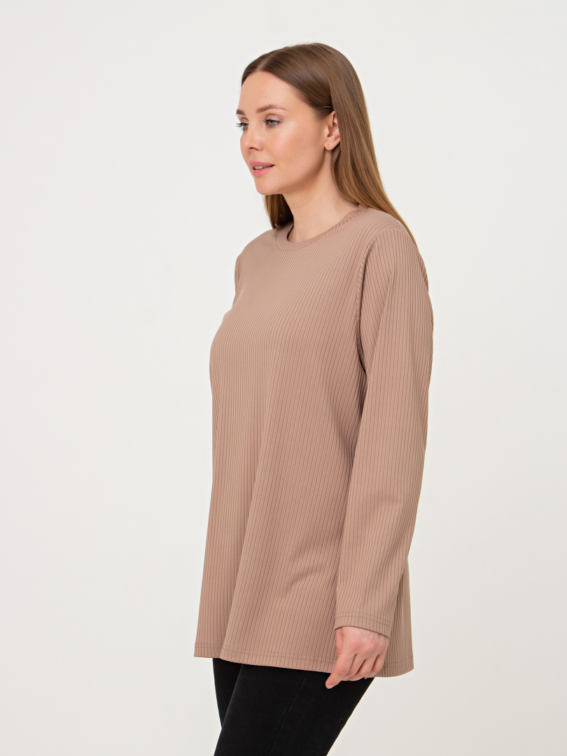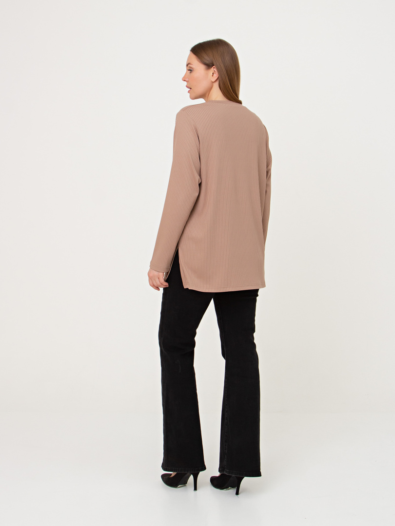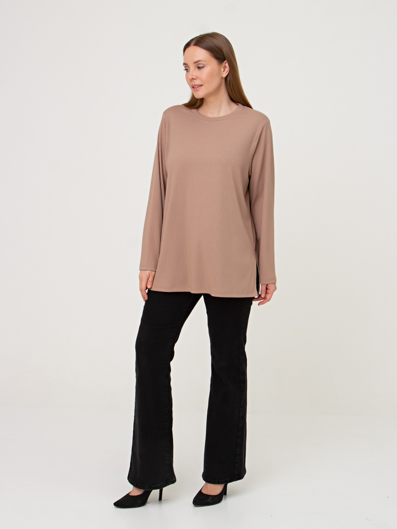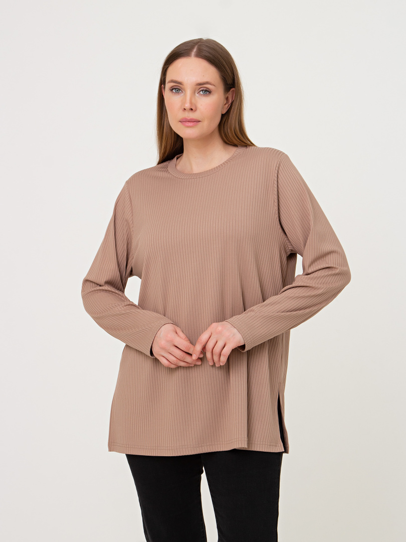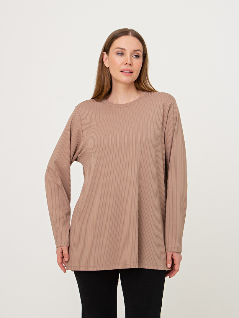 Блуза из мягкого эластичного трикотажа средней длины. Модель прямого покроя с длинным рукавом. Небольшой круглый вырез горловины.