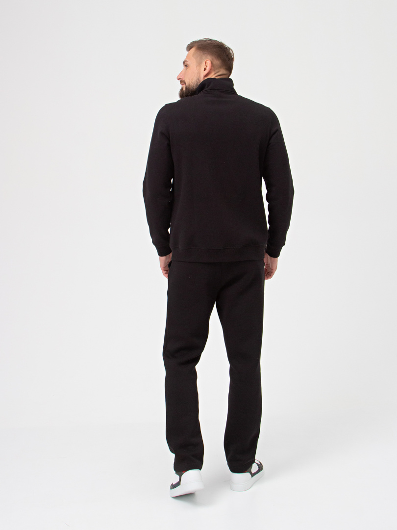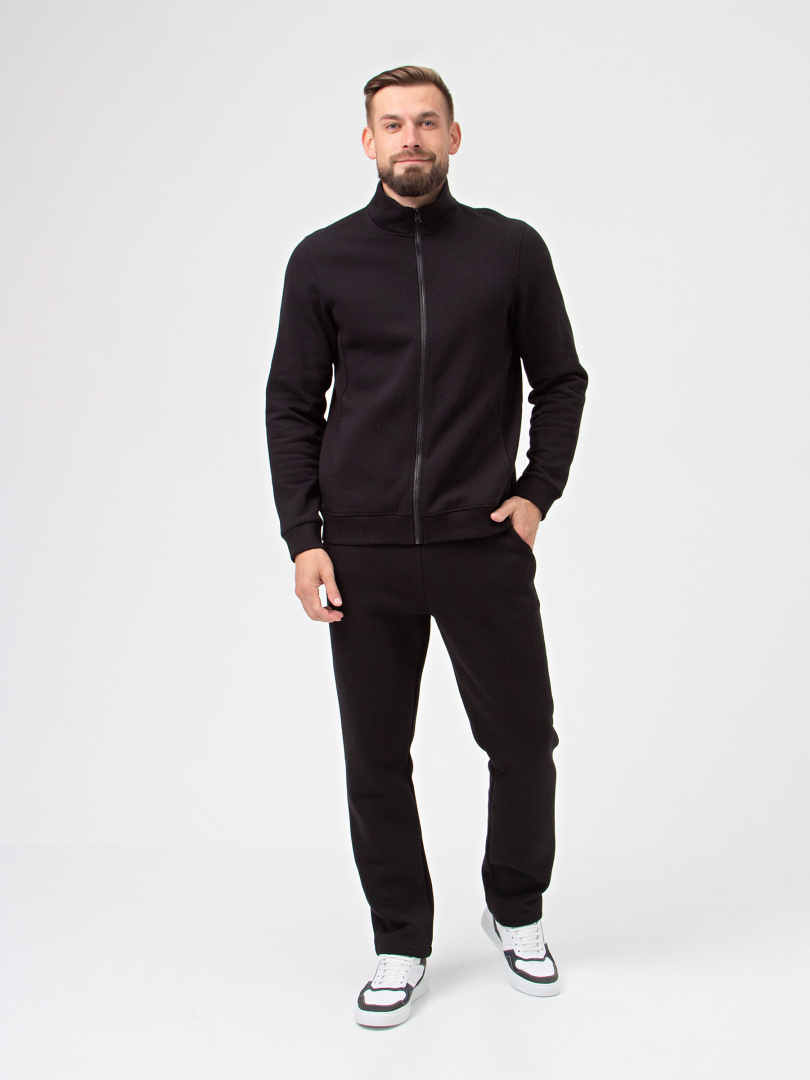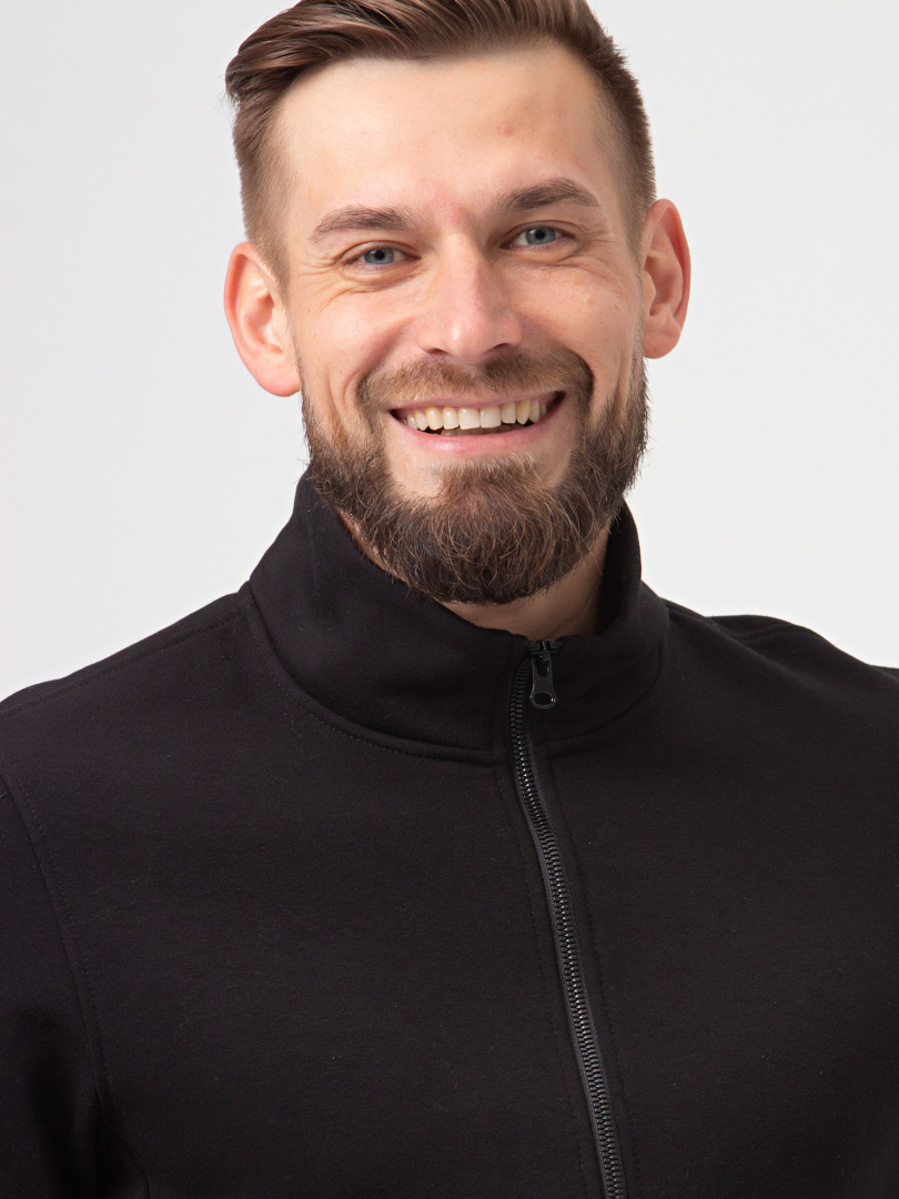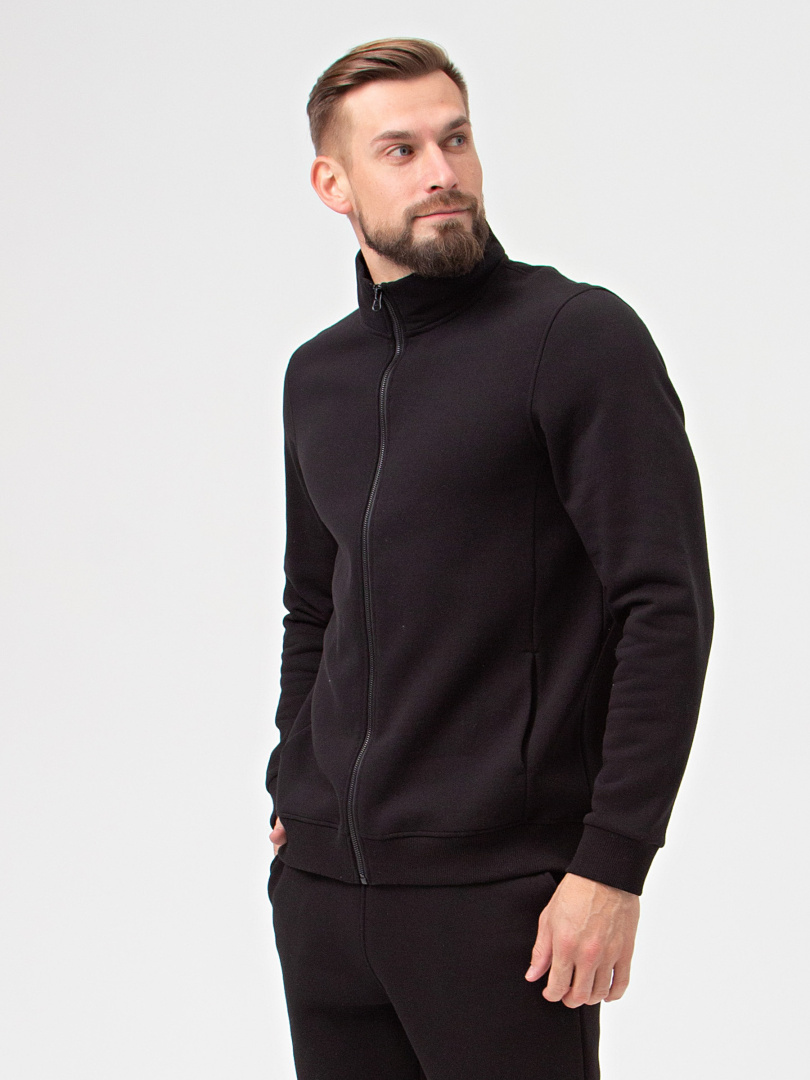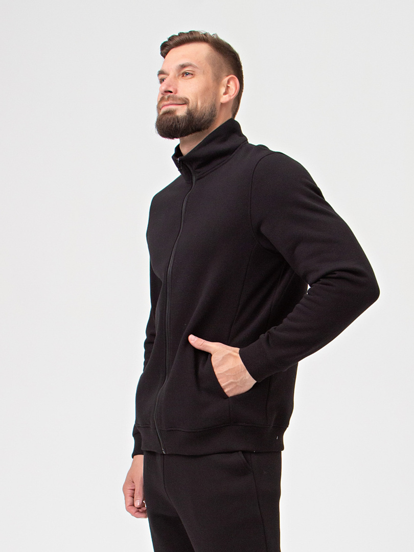 Джемпер средней длины выполнен из плотного футера с начёсом. Покрой прямой, рукав втачной. Воротник - стойка. По переду застёжка-молния. На переде – рельефные швы, в них внутренние карманы. По низу изделия - пояс. Низ рукавов – манжеты.