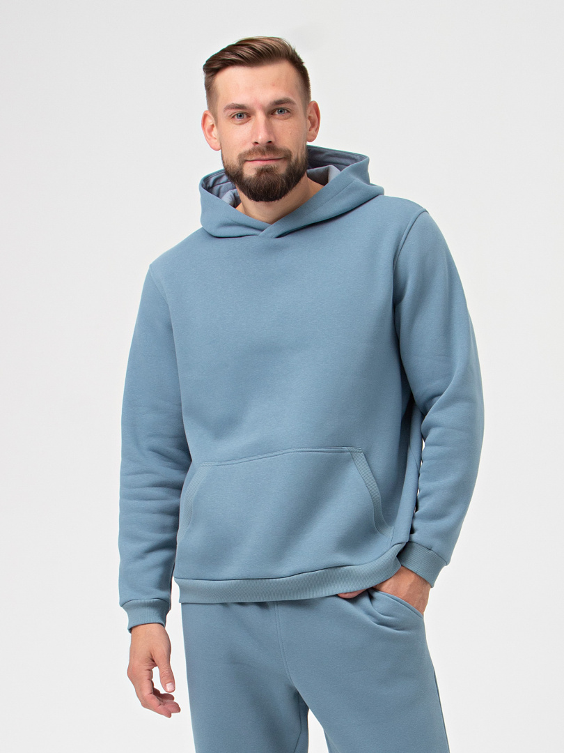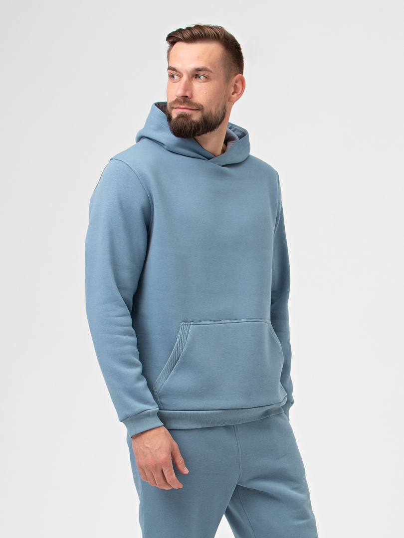Джемпер средней длины с капюшоном, выполнен из плотного трикотажа с начесом. Покрой свободный, рукав со спущенным плечом. По переду - карман. Низ рукавов – манжеты. Низ джемпера – притачной пояс.