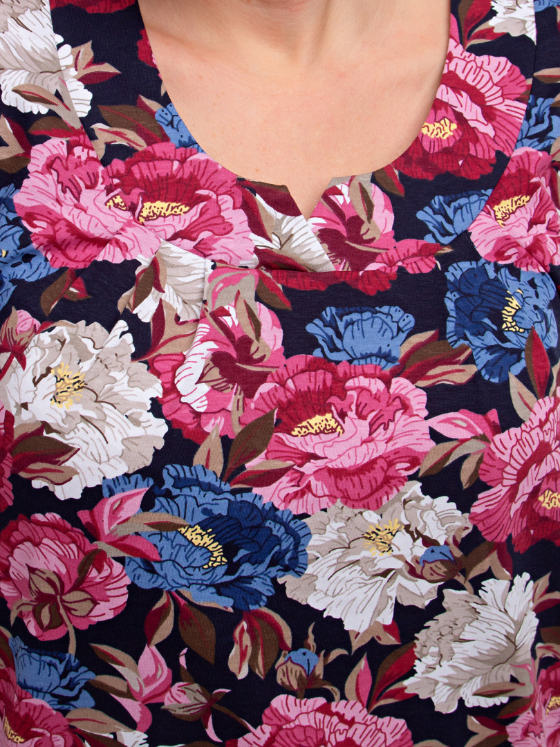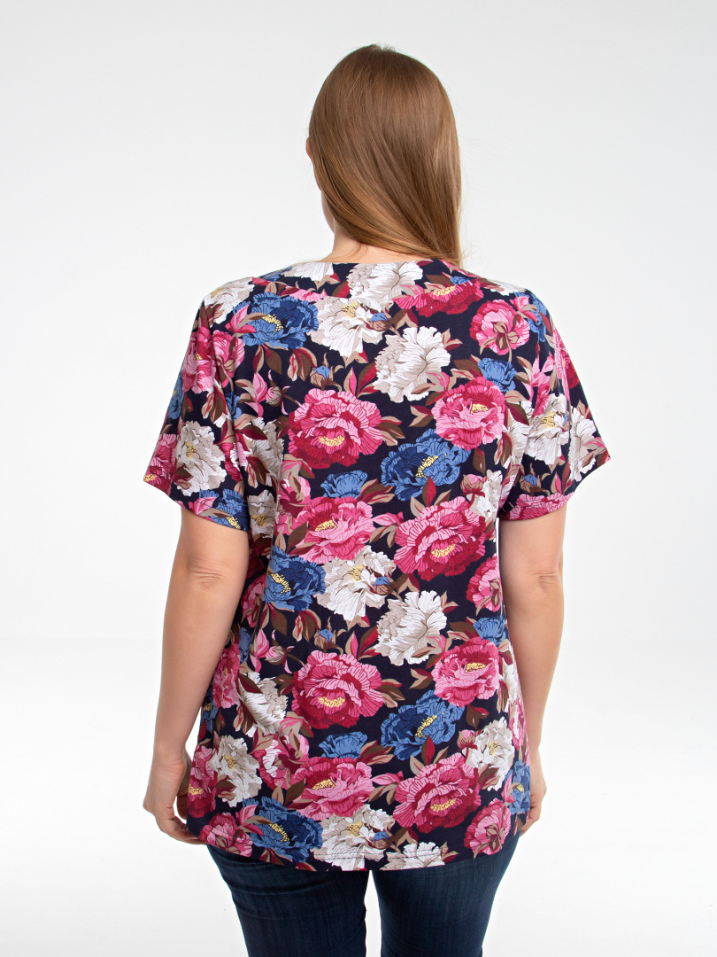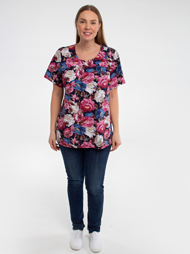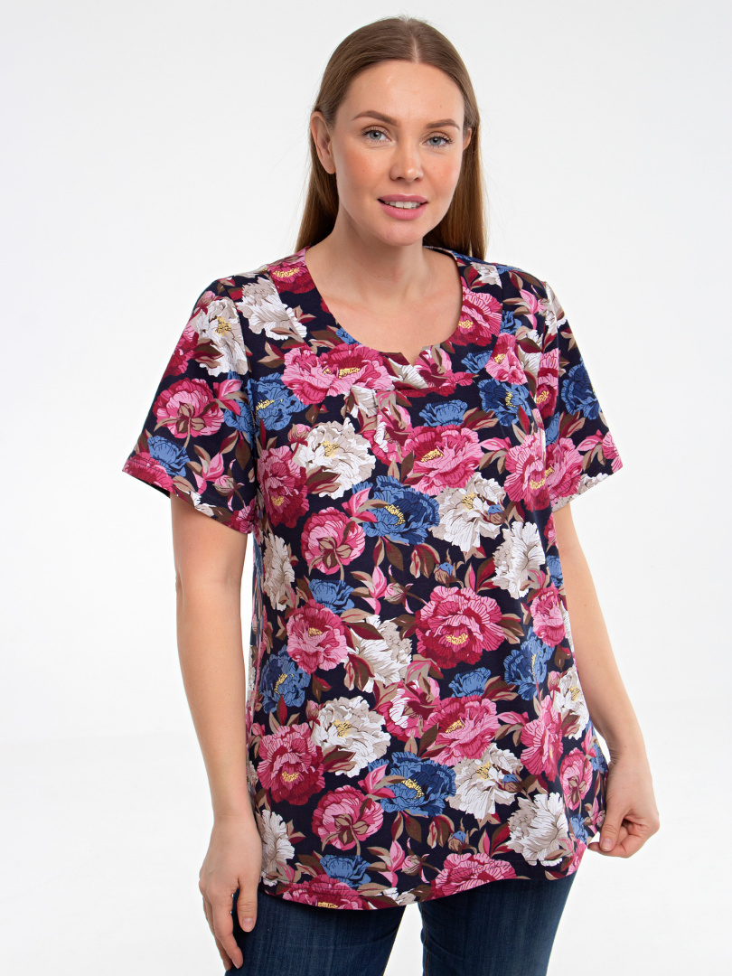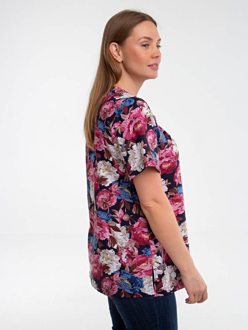 Блуза средней длины, выполнена из трикотажа. Модель полуприлегающего силуэта с разрезами по низу боковых швов. Изделие с коротким втачным рукавом. Горловина декорирована фигурной кокеткой. По низу кокетки переда заложены мягкие защипы.