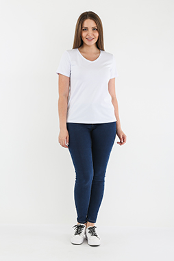 Футболка средней длины прилегающего силуэта из тонкого хлопка с лайкрой. Модель имеет короткий втачной рукав и V-образный вырез горловины.