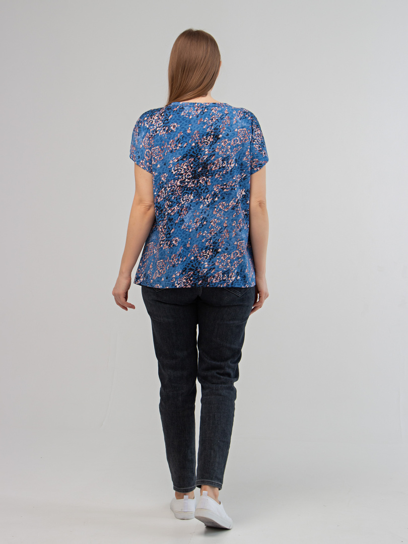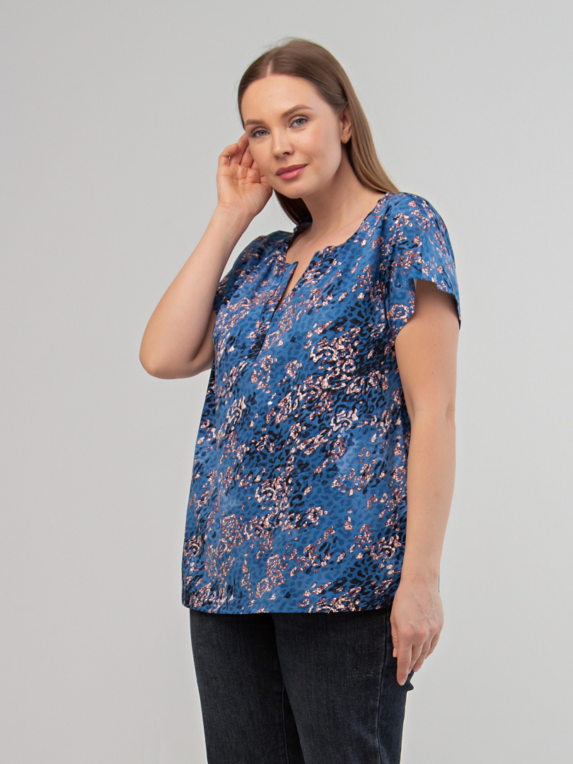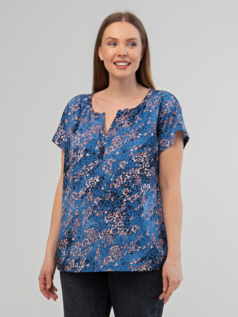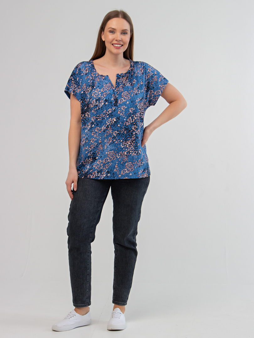 Блуза средней длины с круглым вырезом и декоративной планкой. По горловине – сборка. Покрой свободный со спущенным цельнокроеным рукавом.