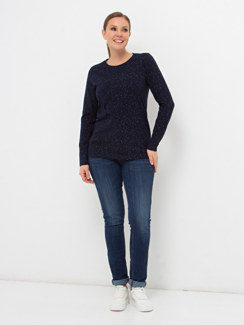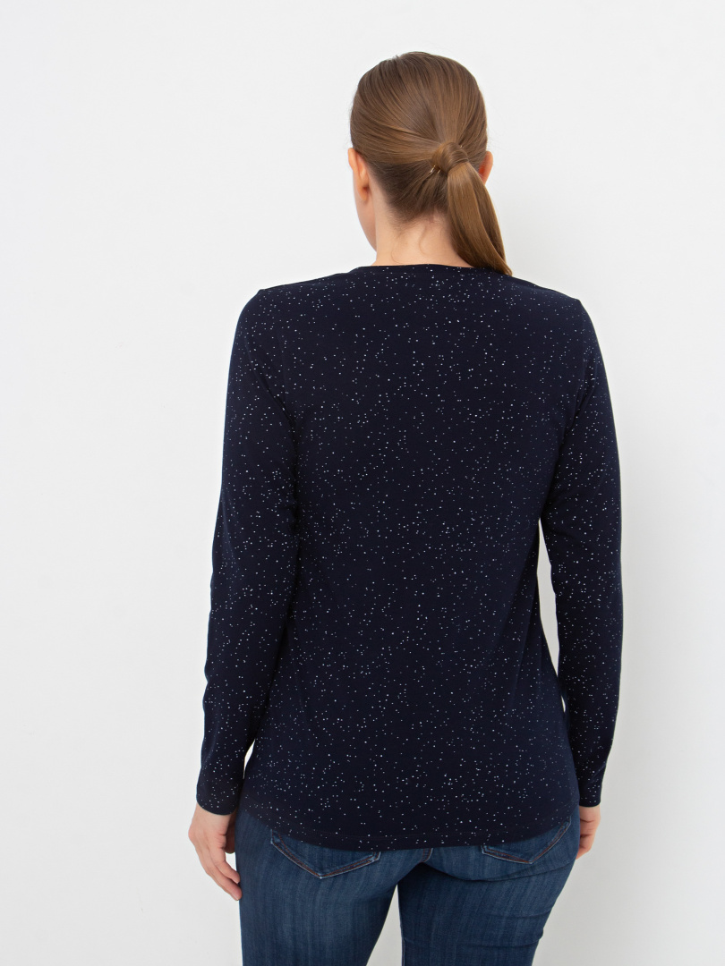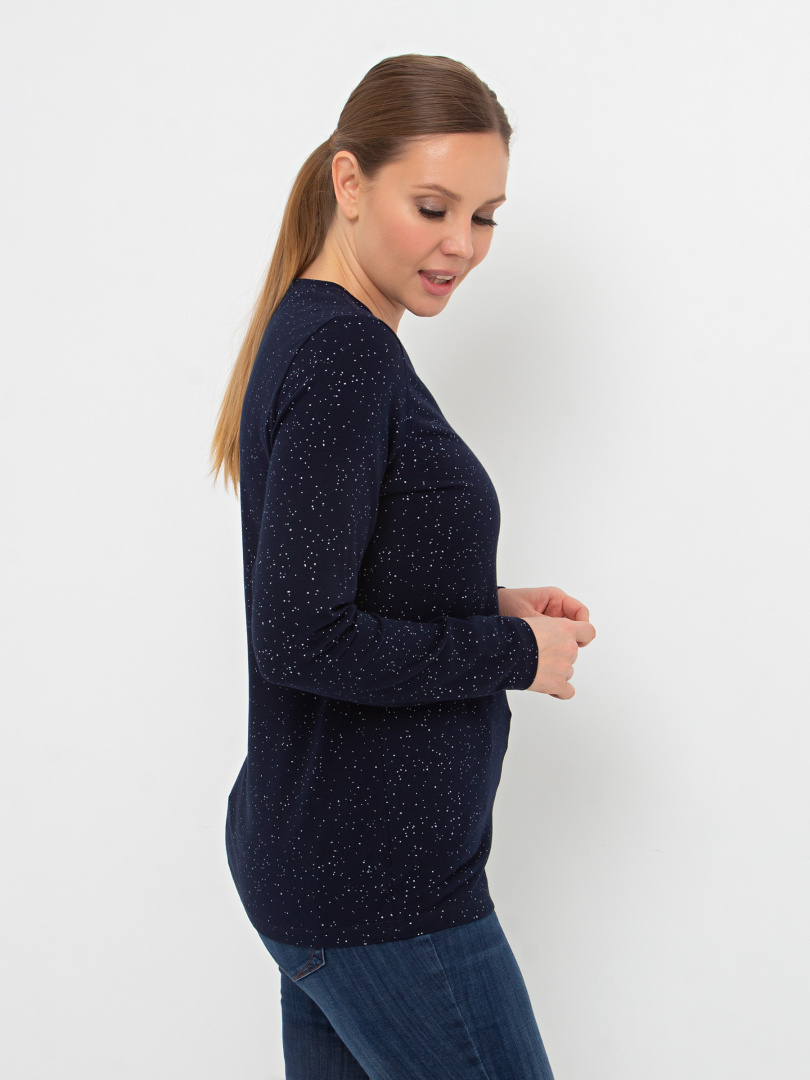 Блуза из мягкого эластичного трикотажа средней длины. Модель прямого покроя с длинным рукавом. Небольшой круглый вырез горловины.