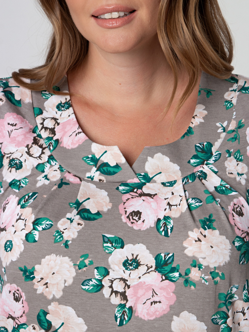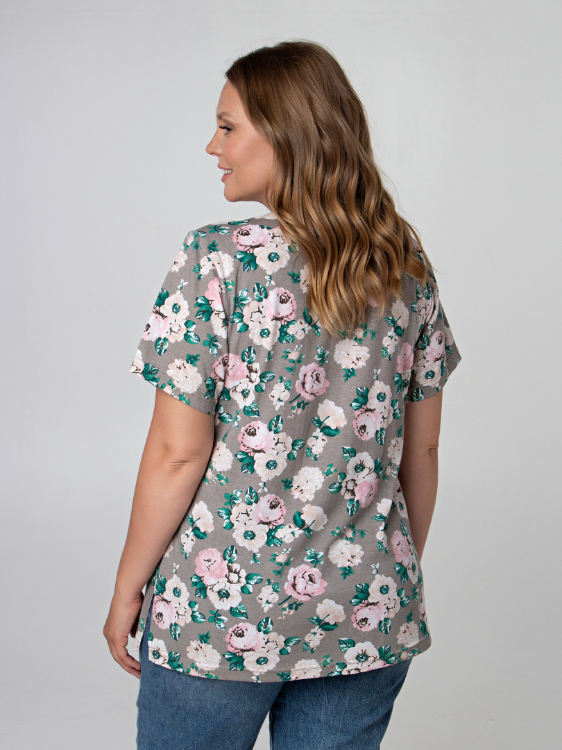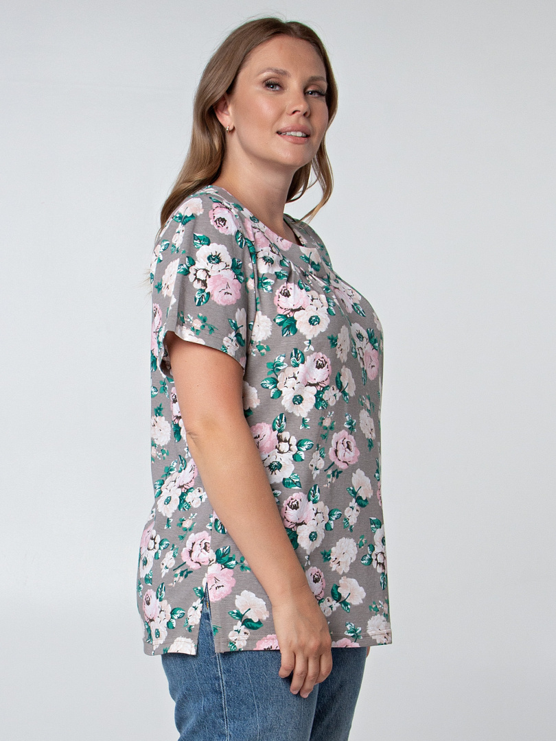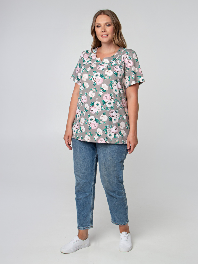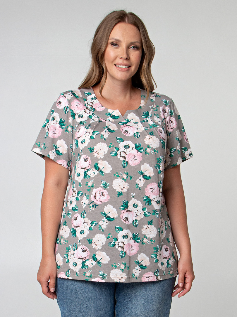 Блуза средней длины, выполнена из трикотажа. Модель полуприлегающего силуэта с разрезами по низу боковых швов. Изделие с коротким втачным рукавом. Горловина декорирована фигурной кокеткой. По низу кокетки переда заложены мягкие защипы.