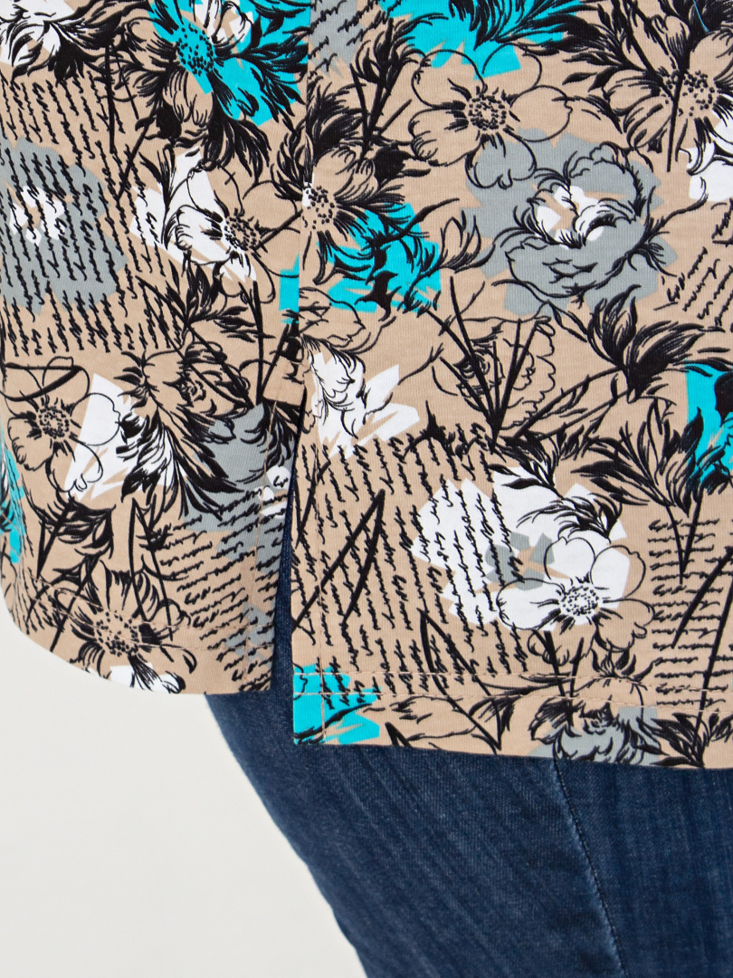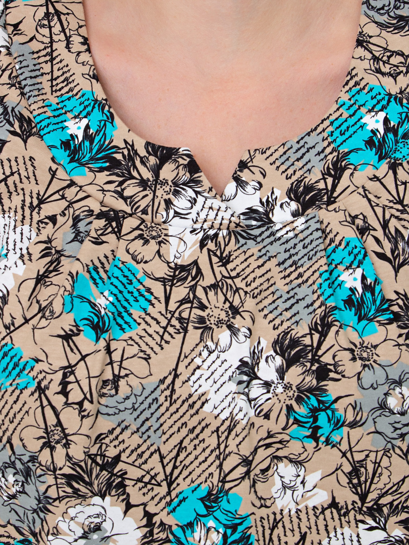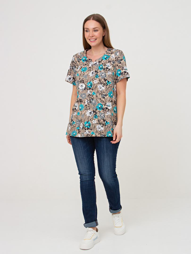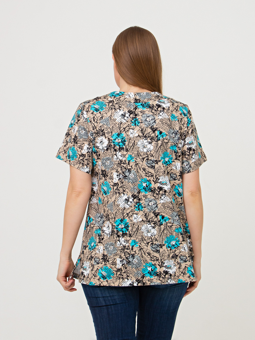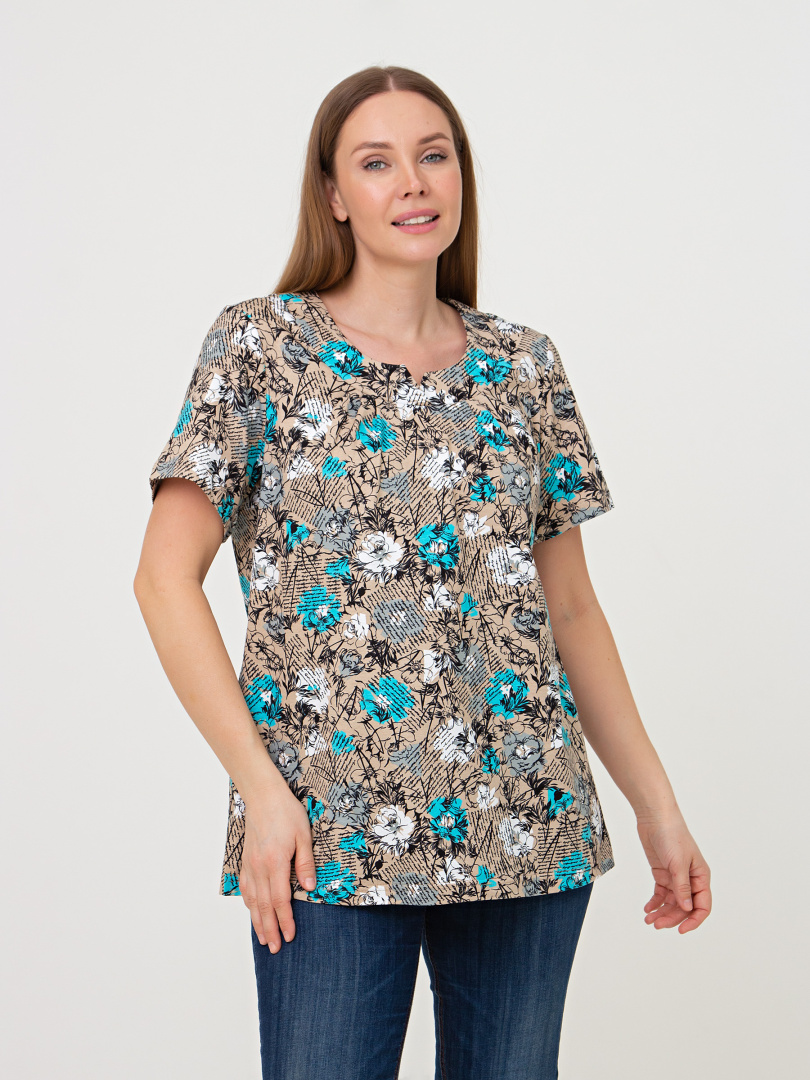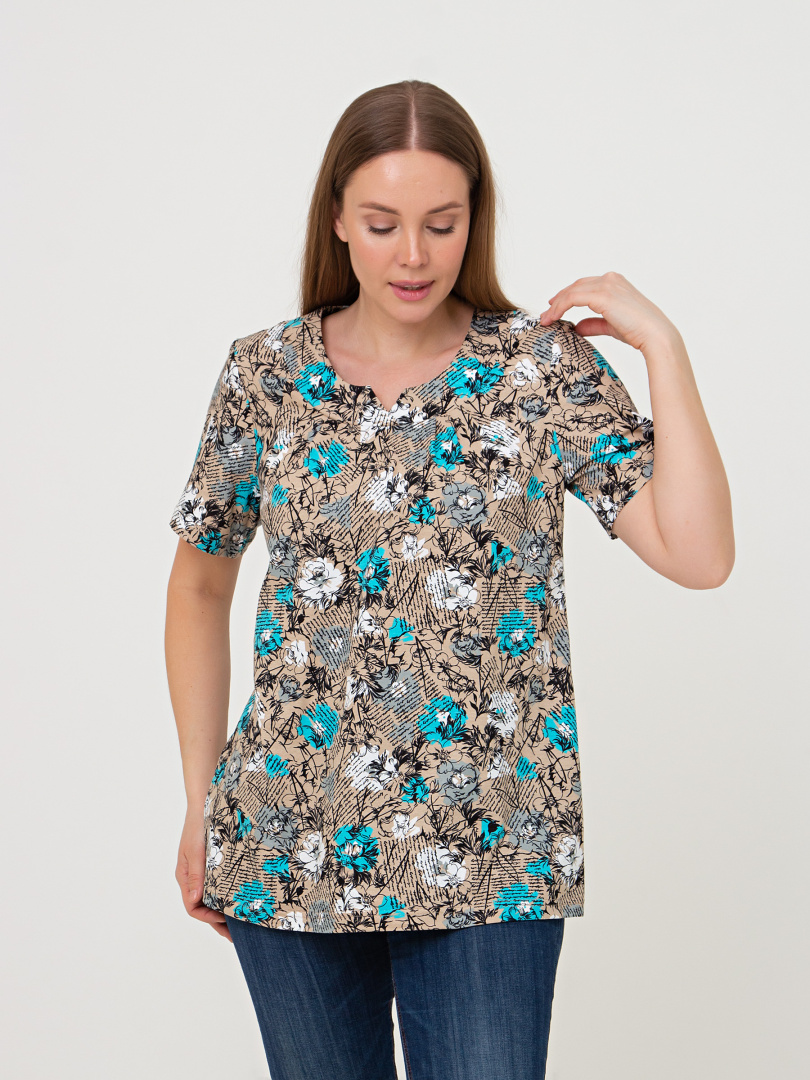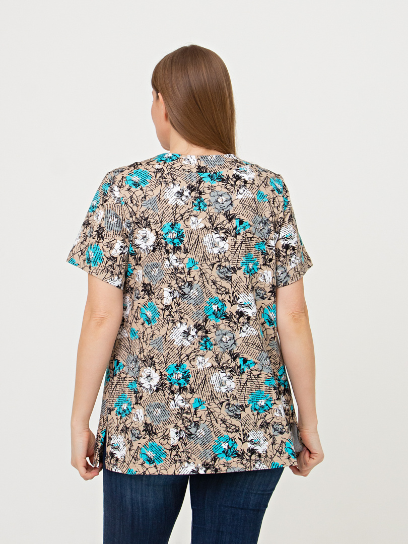 Блуза средней длины, выполнена из трикотажа. Модель полуприлегающего силуэта с разрезами по низу боковых швов. Изделие с коротким втачным рукавом. Горловина декорирована фигурной кокеткой. По низу кокетки переда заложены мягкие защипы.